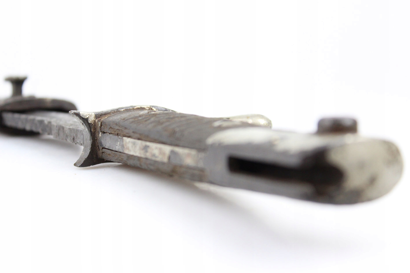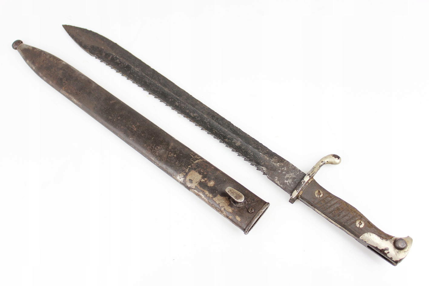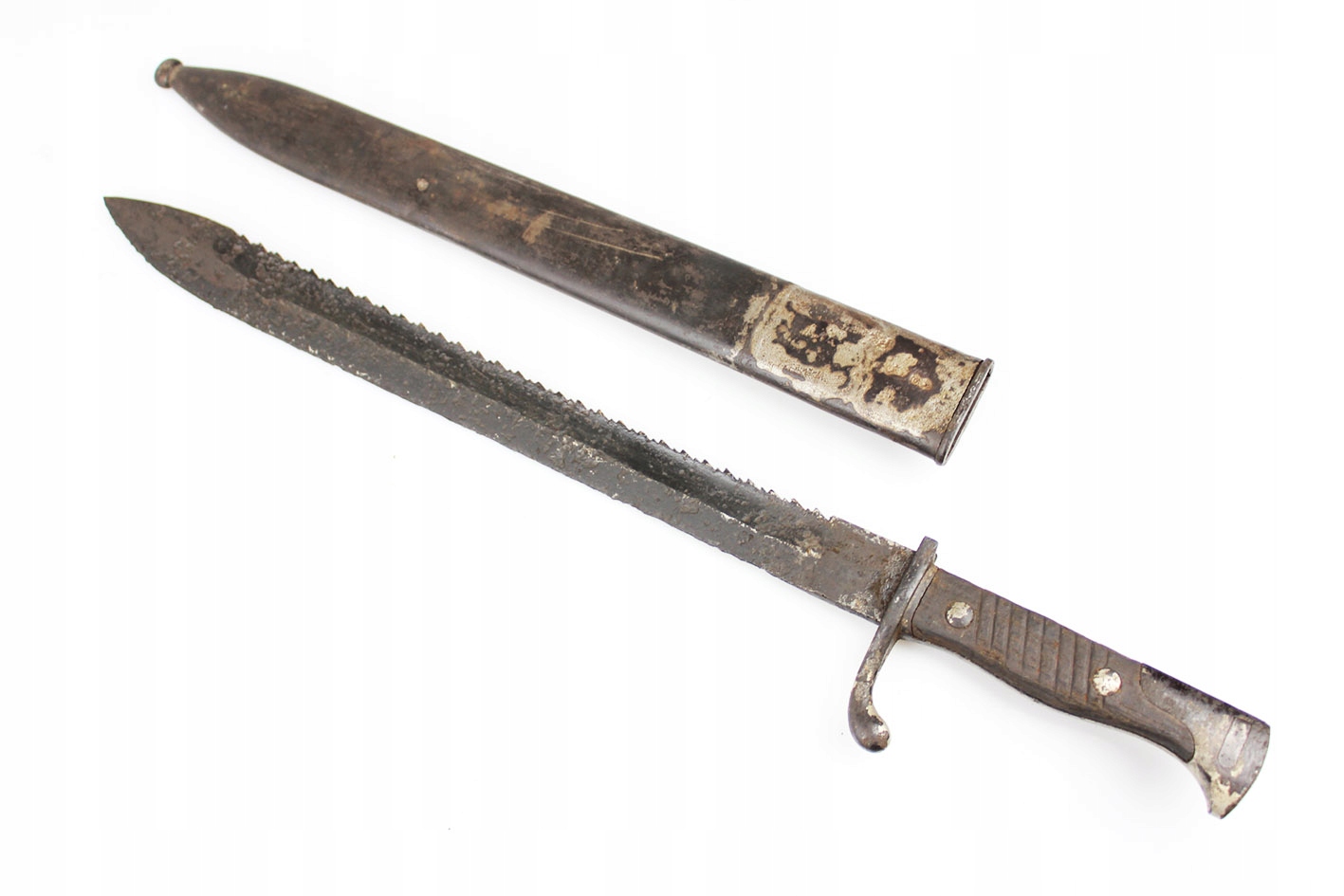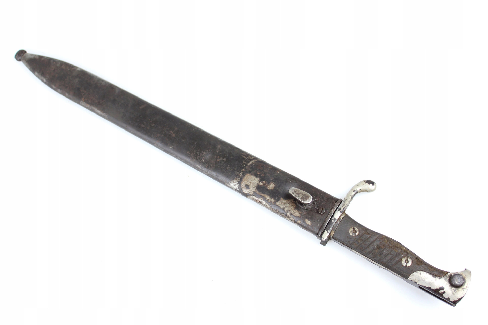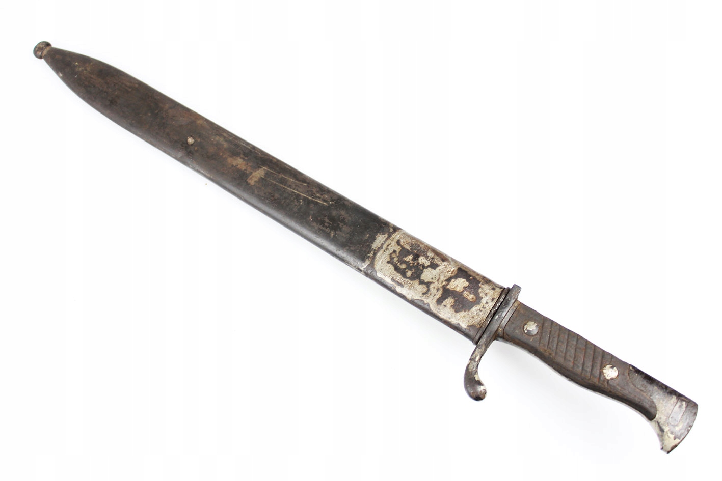 Оригинальный немецкий штык для винтовки Mauser Mod. S98/05 Old Type без пожарной крышки с пилой на задней части лезвия и характерными усами Jelca, покрывающим ствол. Копия не откручена. Одиночное лезвие с двойной вогнутой броней, одна подпись: на пороге подписи производителя лезвия: Weyersberg Kirschbaum & Cie. Эта компания была основана в 1883 году из -за слияния двух очень старых лейблов от Solingen. У обеих компаний была своя товарная марка. Для Вейерсберга это был глава короля, и для Kirschbaum-Głów Knight. После объединения оба товарных знаков появились на лезвиях с 1883 по 1918 год, то есть конец монархии в Германии. Никелевая ручка с деревянной оболочкой с винтами. Кнопка защелки функциональна. Бельдинг с типичными немамиссионными штыками с пилой. К сожалению для ремонта. Влагалище с сильным удушьем. Что именно на фотографиях. Предложение включает в себя широкий выбор военных, включая штыки и многие другие древние безделушки в более низкие цены;)