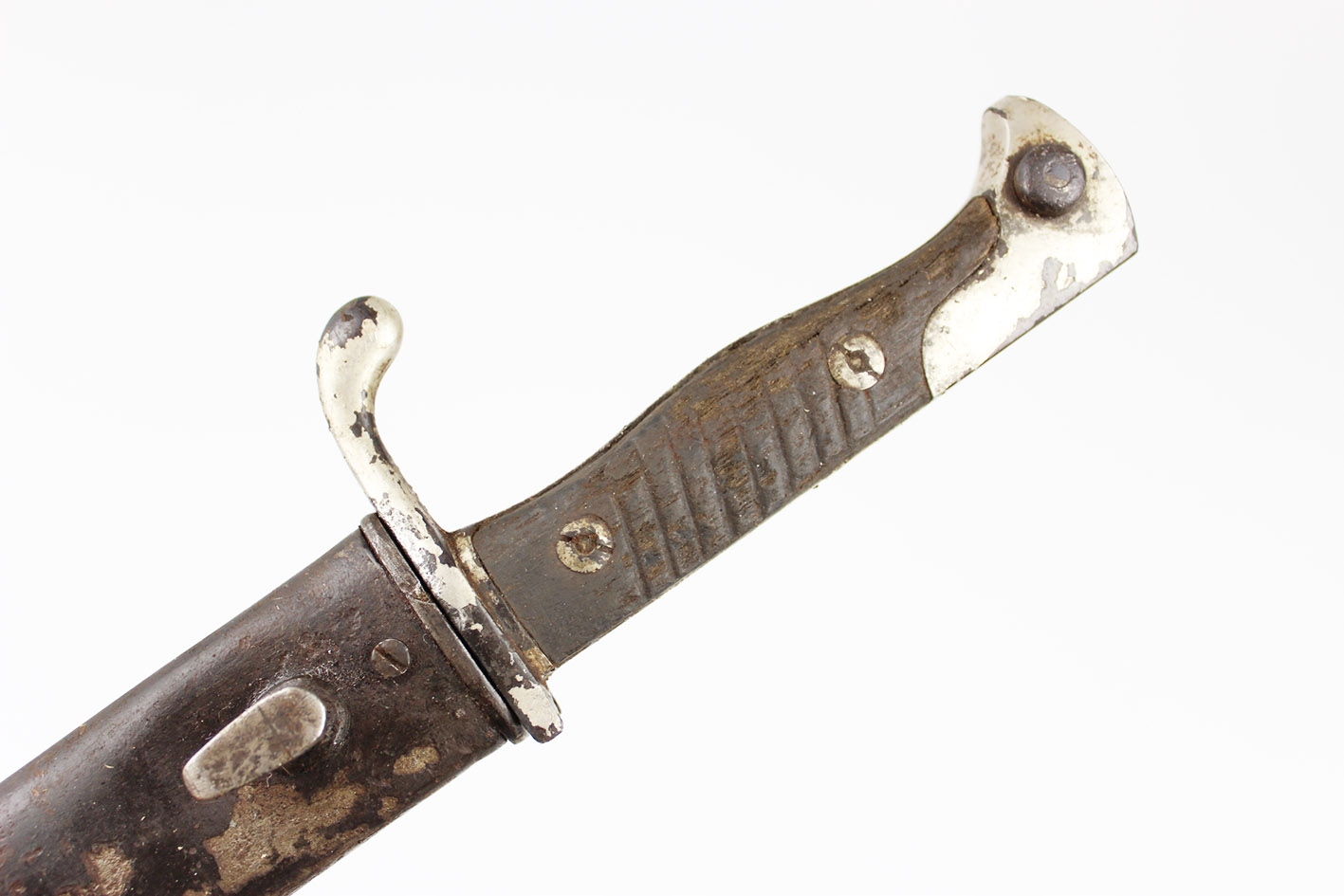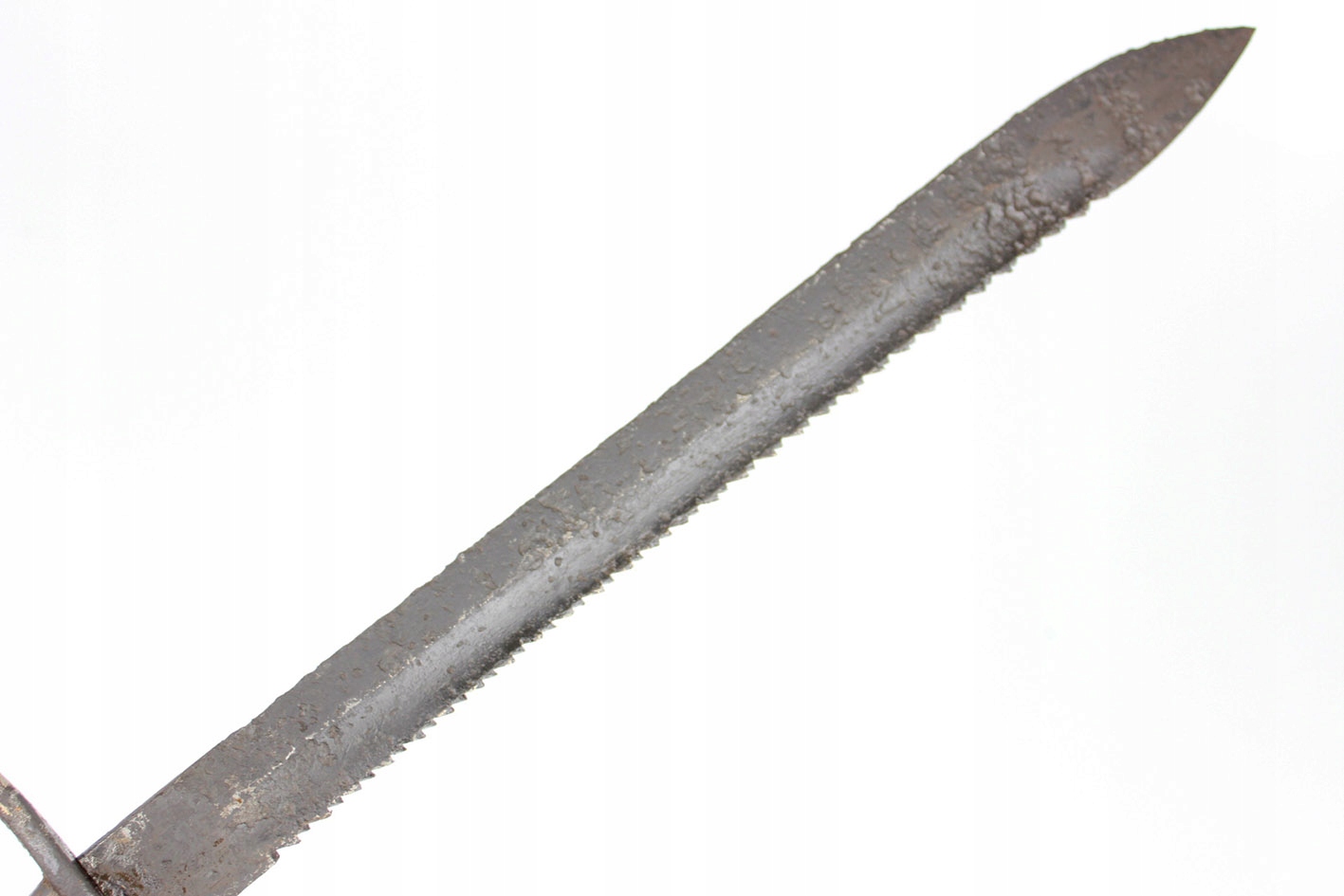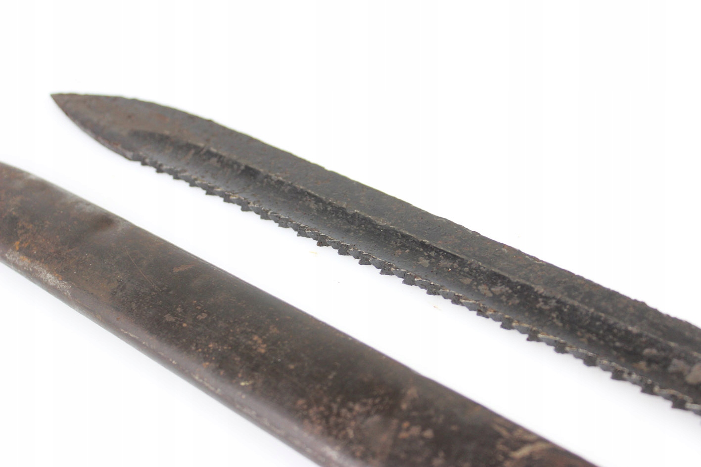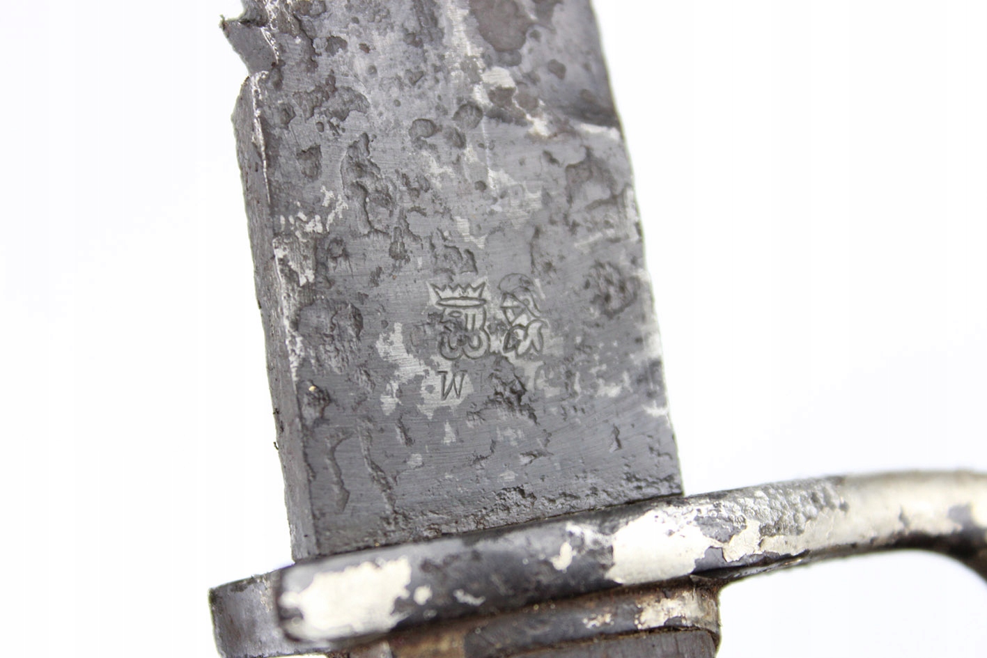 Оригинальный немецкий штык для винтовки Mauser Mod. S98/05 Old Type без пожарной крышки с пилой на задней части лезвия и характерными усами Jelca, покрывающим ствол. Копия не откручена. Одиночное лезвие с двойной вогнутой броней, одна подпись: на пороге подписи производителя лезвия: Weyersberg Kirschbaum & Cie. Эта компания была основана в 1883 году из -за слияния двух очень старых лейблов от Solingen. У обеих компаний была своя товарная марка. Для Вейерсберга это был глава короля, и для Kirschbaum-Głów Knight. После объединения оба товарных знаков появились на лезвиях с 1883 по 1918 год, то есть конец монархии в Германии. Никелевая ручка с деревянной оболочкой с винтами. Кнопка защелки функциональна. Бельдинг с типичными немамиссионными штыками с пилой. К сожалению для ремонта. Влагалище с сильным удушьем. Что именно на фотографиях. Предложение включает в себя широкий выбор военных, включая штыки и многие другие древние безделушки в более низкие цены;)