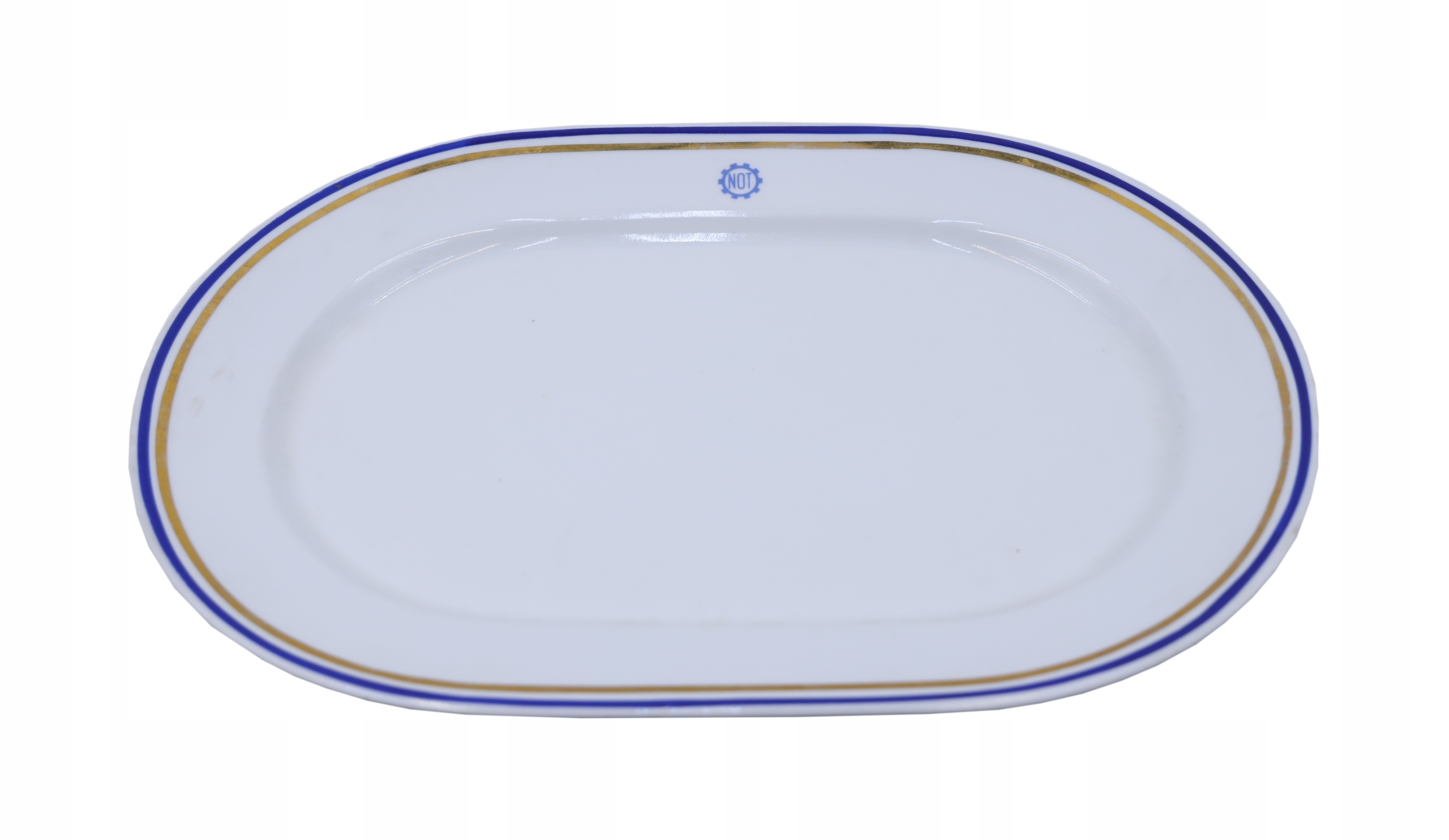 Фарфоровое блюдо из Влоцлавека периода Польской Народной Республики с логотипом Высшей технической организации. Подписано. Размеры: 36 х 24,5 см. Следы использования, устраненный дефект. Рекомендую