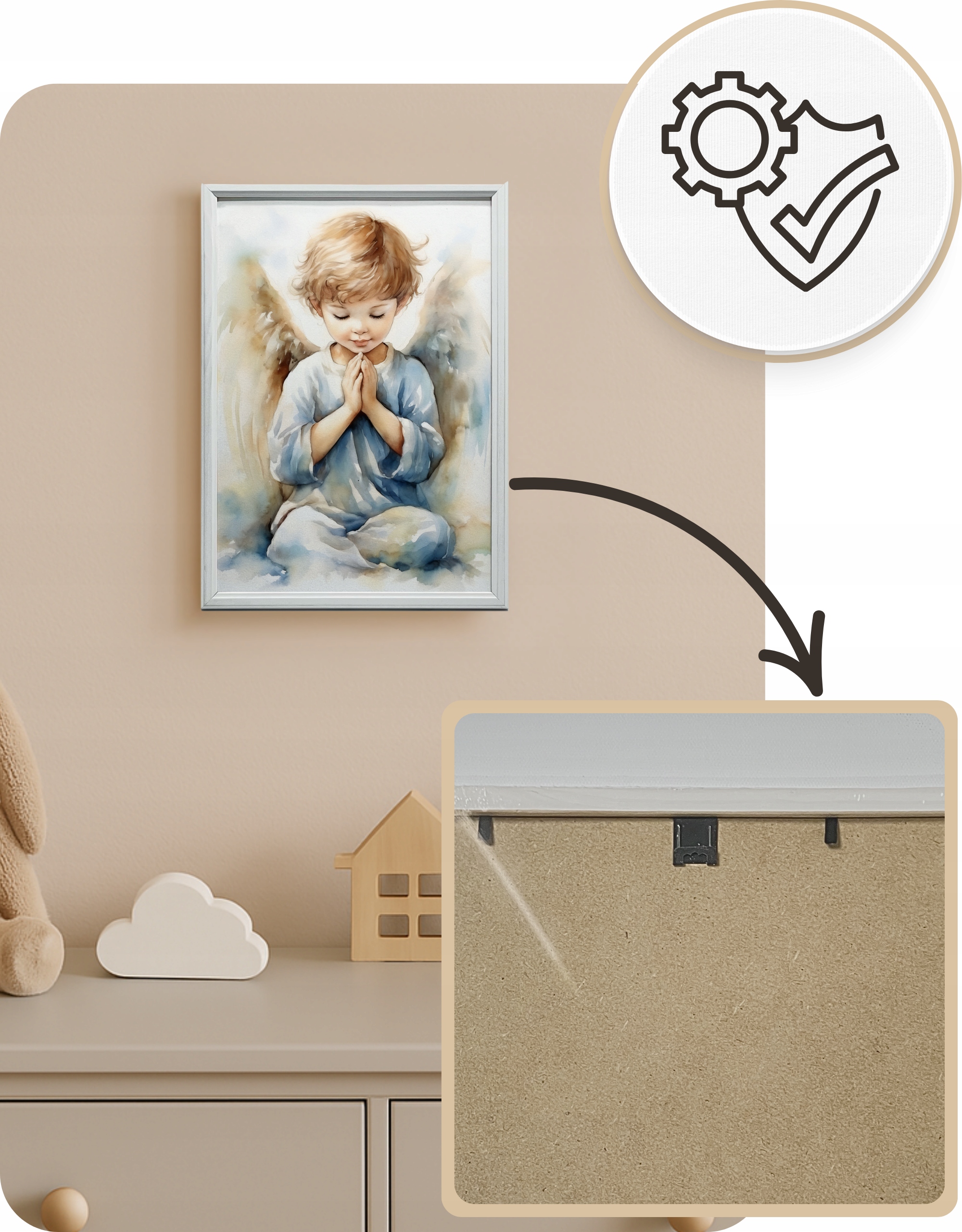 Белая рама в белом, гармонизируется с пастельными цветами картины, создавая эстетическую и вневременную композицию. acryla , который защищает иллюстрацию от повреждения и обеспечивает безопасность в детской комнате.