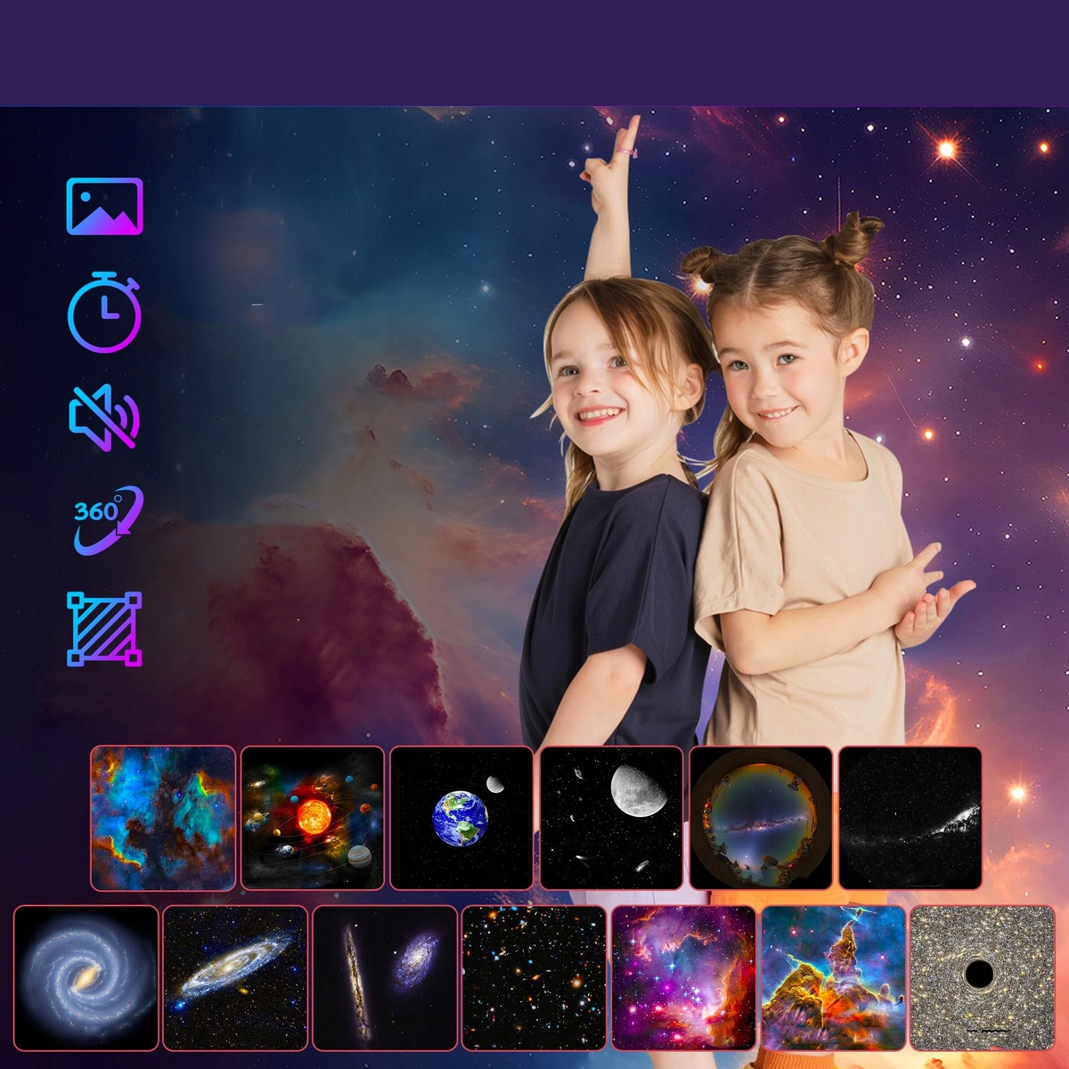 - Галактический проектор 13-в-1 — идеальный образовательный подарок для любого ребенка или взрослого, который интересуется наукой, НАСА, космическими кораблями, галактиками, Солнечной системой и многим другим! Просто подключите кабель USB Type-C (входит в комплект) с собственным адаптером 5 В/2 А (не входит в комплект) к проектору, и устройство включится автоматически. Затем вы можете вставить диск с пленкой в слот и сфокусироваться. Интересно, что ручная смена фильмов также способствует интеллектуальному развитию детей. Для достижения наилучших результатов рекомендуется использовать проектор в абсолютно темном месте.