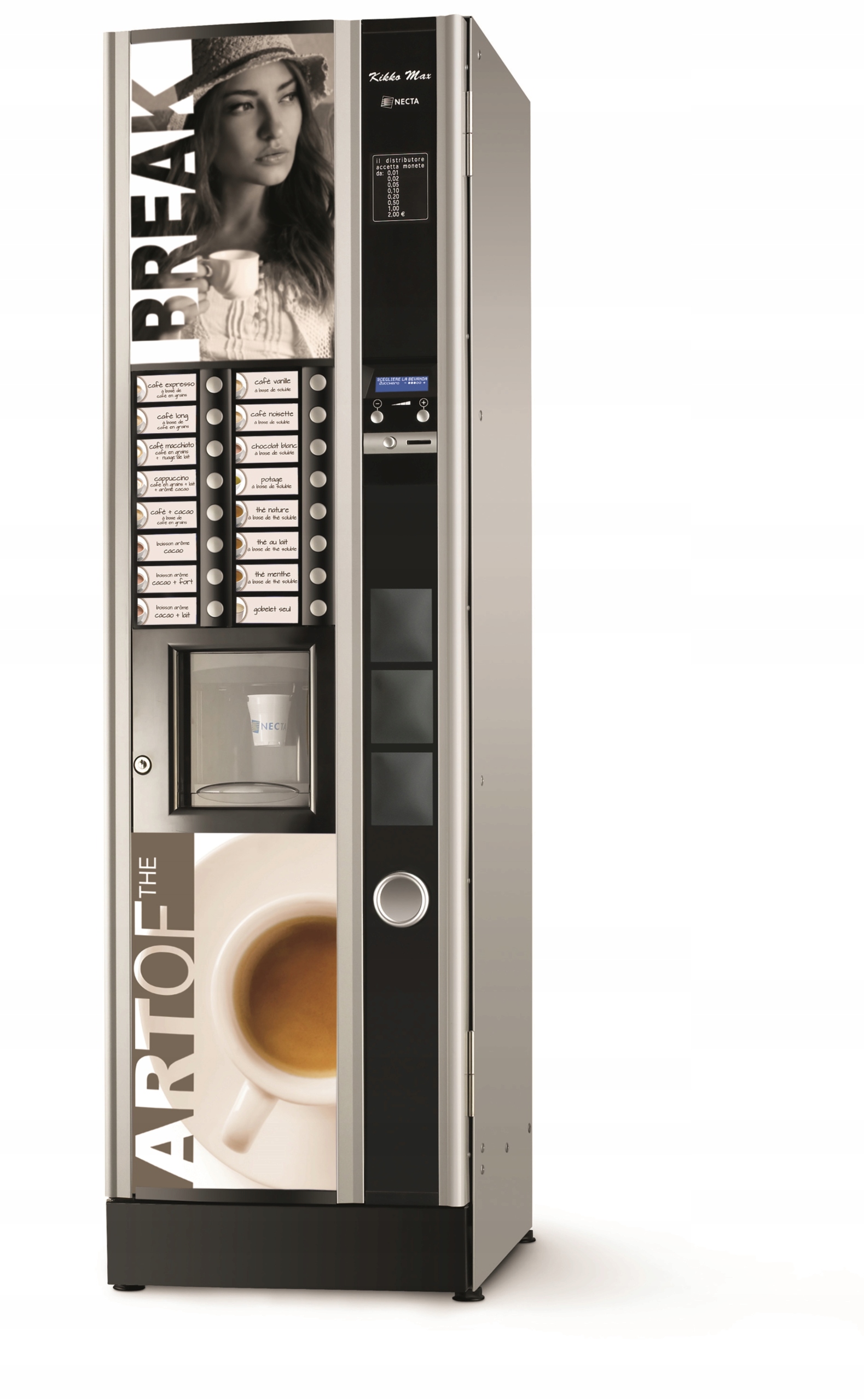 Kikko Max — первый в семействе Necta Hot & Cold, его высота составляет 1700 мм, он представляет собой решение для торговых точек малого и среднего размера с неограниченной вместимостью. Устройство имеет 6 контейнеров и вмещает 620 чашек, каждая с интересной графикой. Сахар, подаваемый машиной, перемешивается, и зона подачи закрывается. Торговый автомат имеет полностью настраиваемый электронный интерфейс, облегчающий выбор и оплату товара.