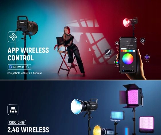 <ул>- Беспроводное приложение и управление 2,4 ГГц — на базе приложения NEEWER для группового управления, OTA-обновления прошивки и инновационных режимов управления освещением, таких как Light Source, Source Match и FX Music. Встроенная система 2.4G обеспечивает каналы 00–99, и когда несколько фонарей настроены на один и тот же канал, каждый из них можно использовать в качестве главного устройства для управления другими в радиусе 262 футов/80 м для синхронизированного изменения. FS300C поддерживает групповое управление с помощью NEEWER FS150B/FS230B/MS60C/MC60B/MS150B/MS150C/BH30S/CB60B.