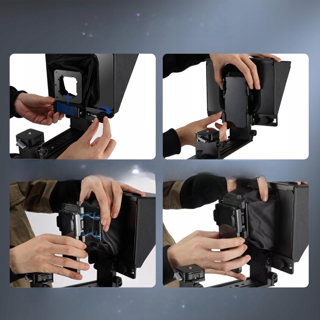 9-дюймовое стекло HD позволяет четко воспроизводить сценарий. Оно обеспечивает светопропускание 75 %, вертикальную регулировку 2,3 см и дальность чтения 2 м, поэтому вы можете легко читать сценарий, не запоминая сначала каждое слово. Несколько резьб 1/4 дюйма и 3/8 дюйма соединяют телесуфлер со штативом или камерой со штативом, а отверстие для обуви в верхней части подходит для установки мини микрофоны, светодиодные фонари и т. д.