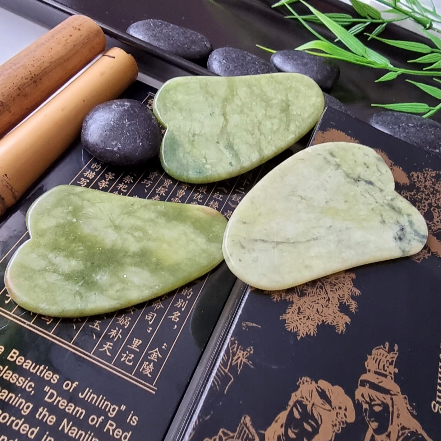 Массажер Гуа Ша представляет собой плоскую нефритовую пластину, используемую для традиционного массажа лица и шеи. Гуа Ша — древняя китайская лечебная техника, используемая для улучшения лимфотока, укрепления мышц лица, разглаживания и уменьшения морщин.