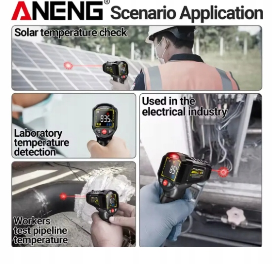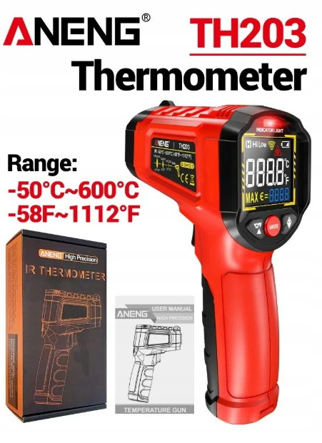 Anng Th203 -это современный инфракрасный термометр без контакта, предназначенный как для домашнего, так и для промышленного использования. Это обеспечивает точные и быстрые измерения температуры в диапазоне от -50 ° C до 600 ° С. благодаря цветовому дисплею VA с подсветкой и лазерным прицелом, он идеально подходит для холодных магазинов, мастерских, кухни или во время технического обслуживания оборудования.