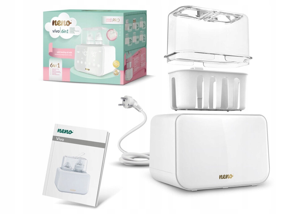 Neno Vivo – обязательный элемент детского гардероба. Современное многофункциональное устройство 6 в 1 – неоценимая помощь уставшим и занятым родителям. Шесть функций, таких как: разморозка, подогрев продуктов, быстрый нагрев, подогрев молока, поддержание температуры и стерилизация, позволяют комплексно готовить еду и поддерживать гигиену принадлежностей для кормления.