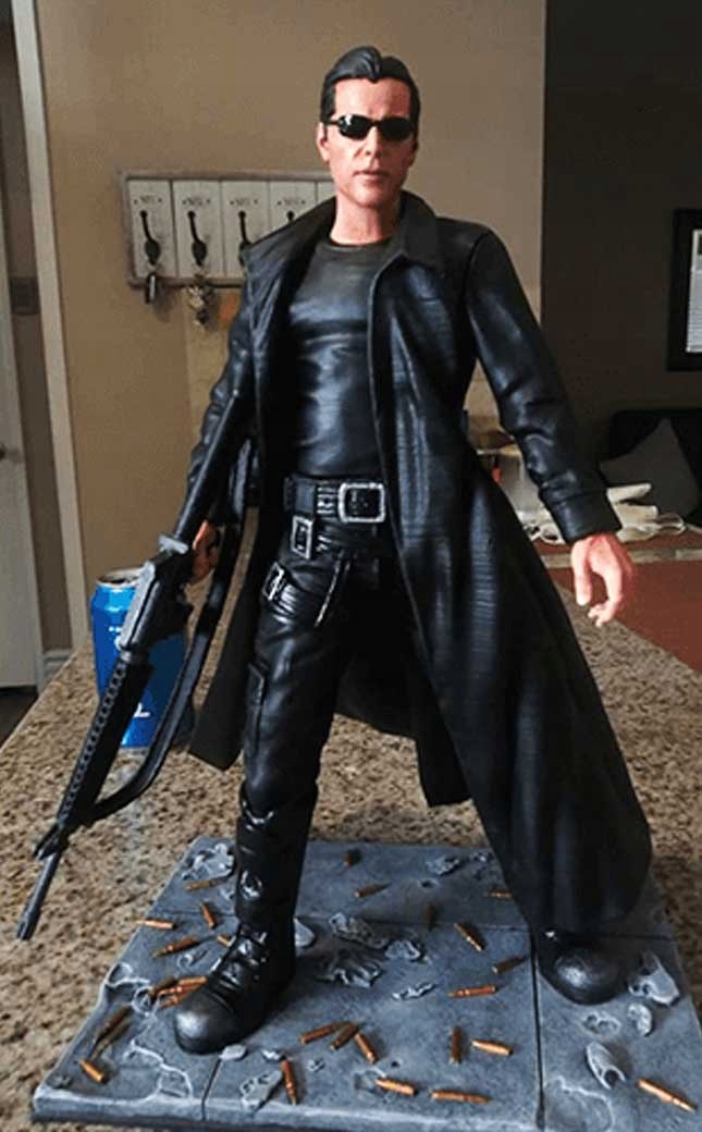 Вдохновленный легендарной трилогией Вачовски, 3D. Художник потратил около 155 часов на создание фигурки главного героя Нео. Автор модели решил использовать культовый постер кинопремьеры «Матрицы», изображающий Нео, Морфеуса, Тринити и Сайфера на характерном фоне шрифтового кода «цифровой дождь». Как и на плакате, фигура изображена в культовом длинном тренче, расстегнутой черной футболке с длинными рукавами и сапогах до колена с пряжками и ремешками. Акцентируя внимание на мельчайших деталях модели, 3D-художник позаботился о том, чтобы добавить к костюму фигурки Нео тактические полосы на ногах. Наконец, фигура изображена с культовой винтовкой М16 и в культовых солнцезащитных очках «Матрица» в ультратонкой оправе. Мрачный и зеленый мир «Матрицы» сделал Киану Ривза поп-иконой, а главный вопрос «Красная капсула» или «Синяя капсула» заставляет многих поклонников научной фантастики по всему миру спорить о выборе.