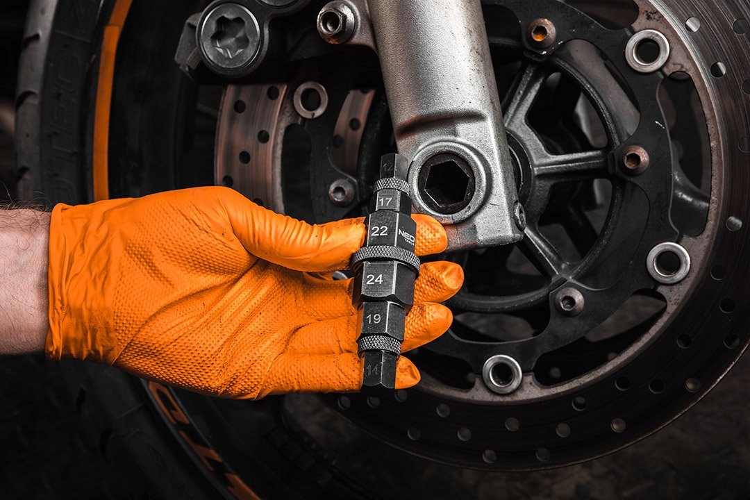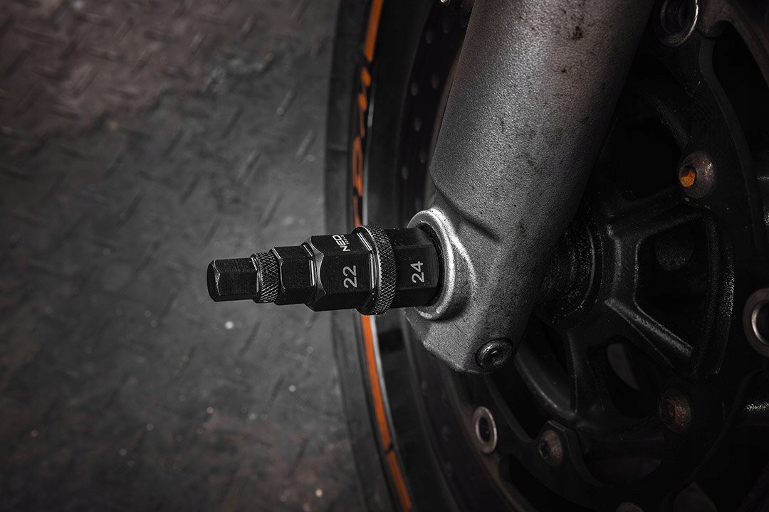 инструмент для мотоциклевых оси 6 в 1, 10-501 Neo-это гениальный 6 в 1 инструмент для демонтажа передней оси в мотоциклах, предлагающий различные размеры внутренних гексагонов: 12, 14, 17, 19, 22, 24 мм. Элемент предотвращает предотвращение оси при затягивании или ослаблении колесной гайки. Это полезно на семинарах профессионалов и автомобильных энтузиастов.
