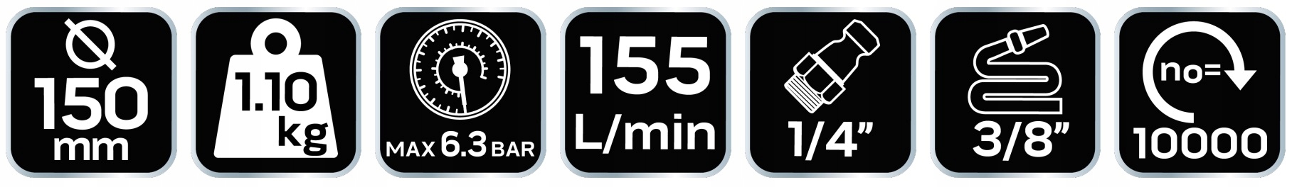 Связок имеет щит диаметром 125/150 мм. достигает скорости 10 000 революций в минуту , а среднее потребление воздуха составляет 155 л/мин.