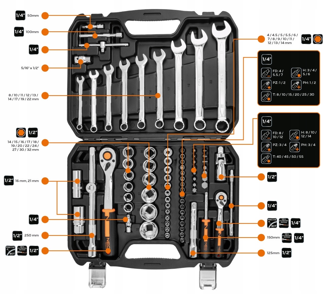 Гаечные ключи торцевые ½", ¼", набор 82 шт., CRV, 10-059 NEO — качественный набор из 82 шт. изделий, предлагаемый в удобном пластиковом кейсе с металлическими защелками и удобной ручкой. Вертикальное размещение в нем элементов гарантирует большее удобство использования и более быстрый сбор необходимых аксессуаров. В комплект входят следующие инструменты и аксессуары: