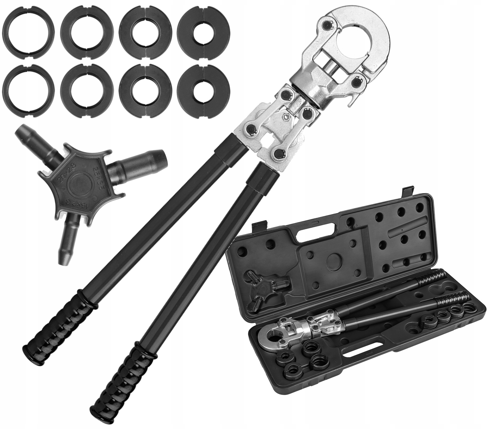 Полезный в гидравлических работах ручной инструмент — пресс для обжима соединителей PEX марки NEO. Позволяет осуществлять высокую точность и плотное обжатие соединителей усилием 60 кН. Предлагается в комплекте с калибратором для труб диаметром 16, 20 и 25 мм с устройством для удаления заусенцев, позволяющим придать трубам идеально круглое сечение. Праска также имеет 8 шт. разъемов типа U и TH. Матрицы U (16 мм, 20 мм, 25 мм, 32 мм) и матрицы TH (16 мм, 20 мм, 26 мм, 32 мм) позволяют быстро заменять прессы между работами. Вращающаяся на 360 градусов головка позволяет добраться до труднодоступных мест, а телескопические рычаги с расстоянием между 58–83 см уменьшат количество усилий, необходимых для работы. Пресс для обжима разъемов марки NEO предлагается в практичном кейсе для удобства хранения и транспортировки.