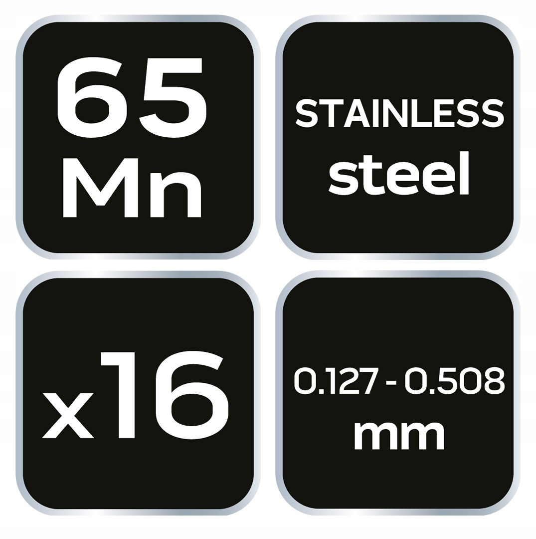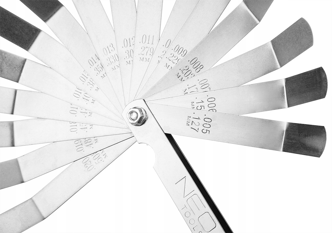 Толмомер на 16 гнутых лопастей (0,127 - 0,508 мм) 65МН/нержавеющая сталь 11-192 от NEO – практичный инструмент, позволяющий измерить расстояние между двумя элементами конструкции, когда невозможно использовать другой измерительный прибор. Он имеет 16 изогнутых створок толщиной от 0,127 до 0,508 мм, результаты работы которых можно легко прочитать даже после вырезания инструмента из паза – поэтому его используют и в ситуациях, когда пространство ограничено. Он позволяет измерять зазоры подшипников или зазоры клапанов двигателя. В свою очередь садовод может самостоятельно проверить и отрегулировать зазор на электродах свечи зажигания газонокосилки или бензопилы. Щуп марки NEO изготовлен из твердой стали 65 МН и нержавеющей стали. Идеально подходит для автомастерских и гаражей автовладельцев.