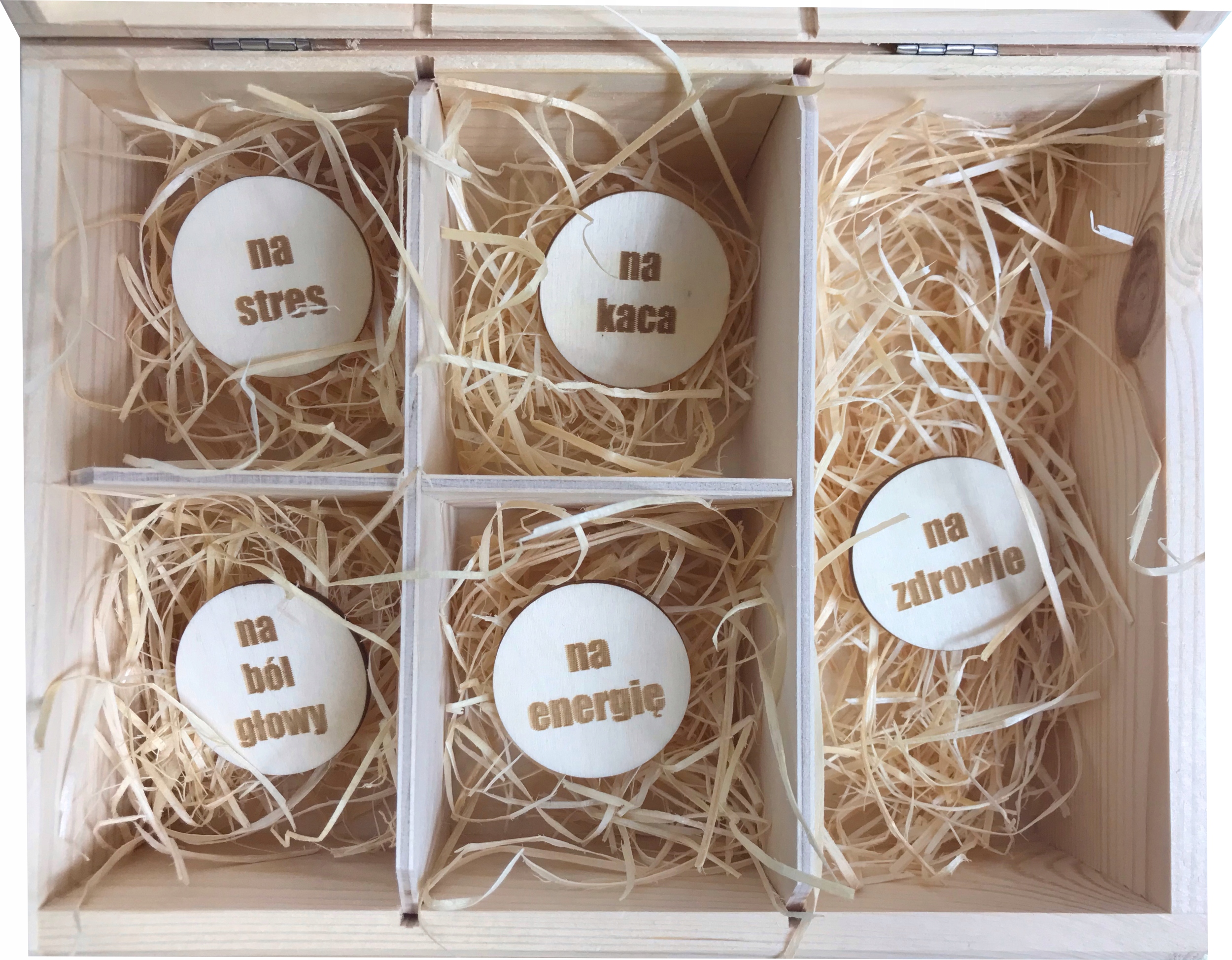 При покупке у нас на аукционе , вы получите набор с гравировкой на крышке, 5 штук деревянных колец с гравировкой и древесной шерсти.