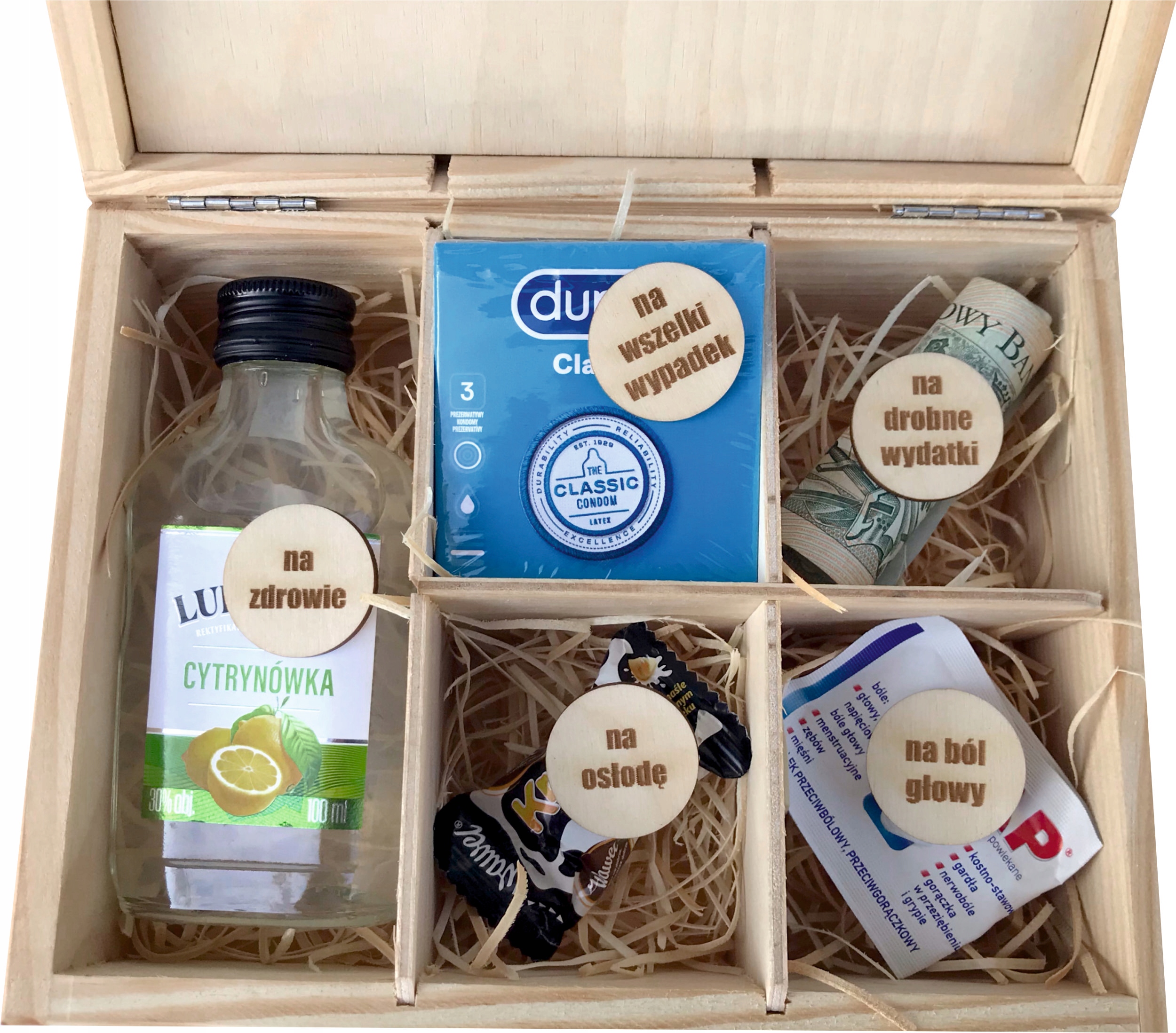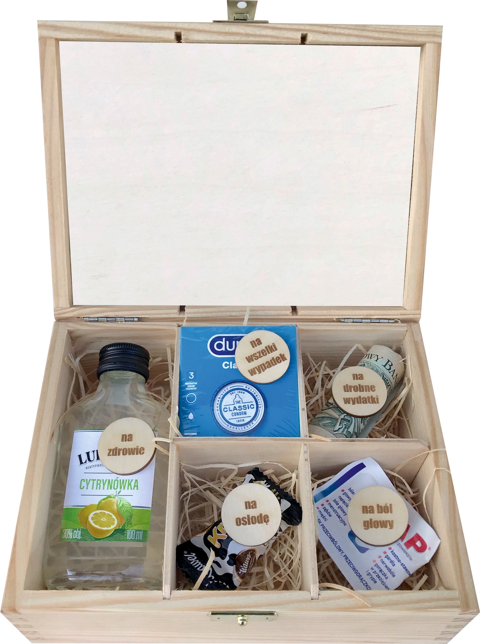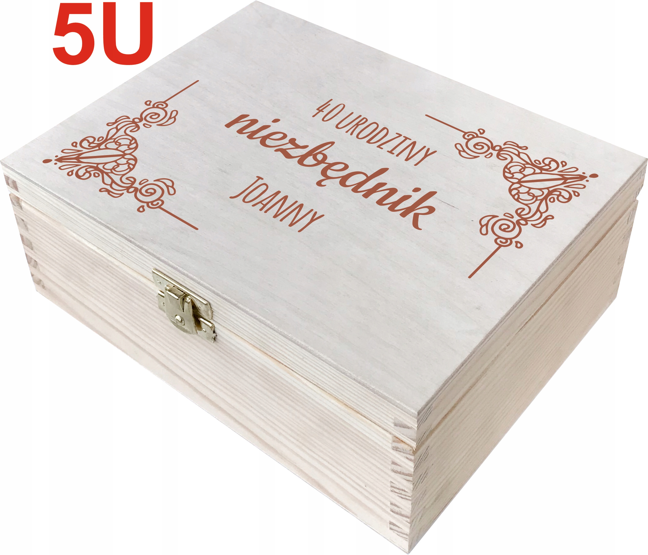 Гравировка на крышке коробки подбирается индивидуально под заказ. Это значит, что в зависимости от мотива мы выгравируем на нем имя, год рождения или возраст получателя. Например, на мотиве 9U можно выгравировать «АПТЕЧКА ПЕРВОЙ ПОМОЩИ КАСИ НА ДЕНЬ РОЖДЕНИЯ» и соответствующий номер, например 45.