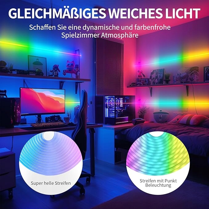 - Динамичная и красочная: неоновая светодиодная лента длиной 8 м с технологией RGB + IC, включая 768 диодов.