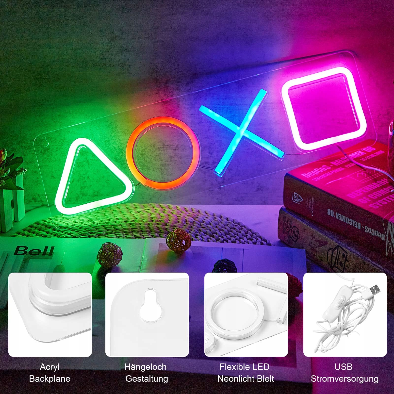 4 Знаменитые неоновые огни могут использоваться в качестве украшения игровой комнаты или в качестве подсветки иконы на подставке для телевизора, освещение иконы подсветки PlayStation осветляет темноту с тонким красочным сиянием.