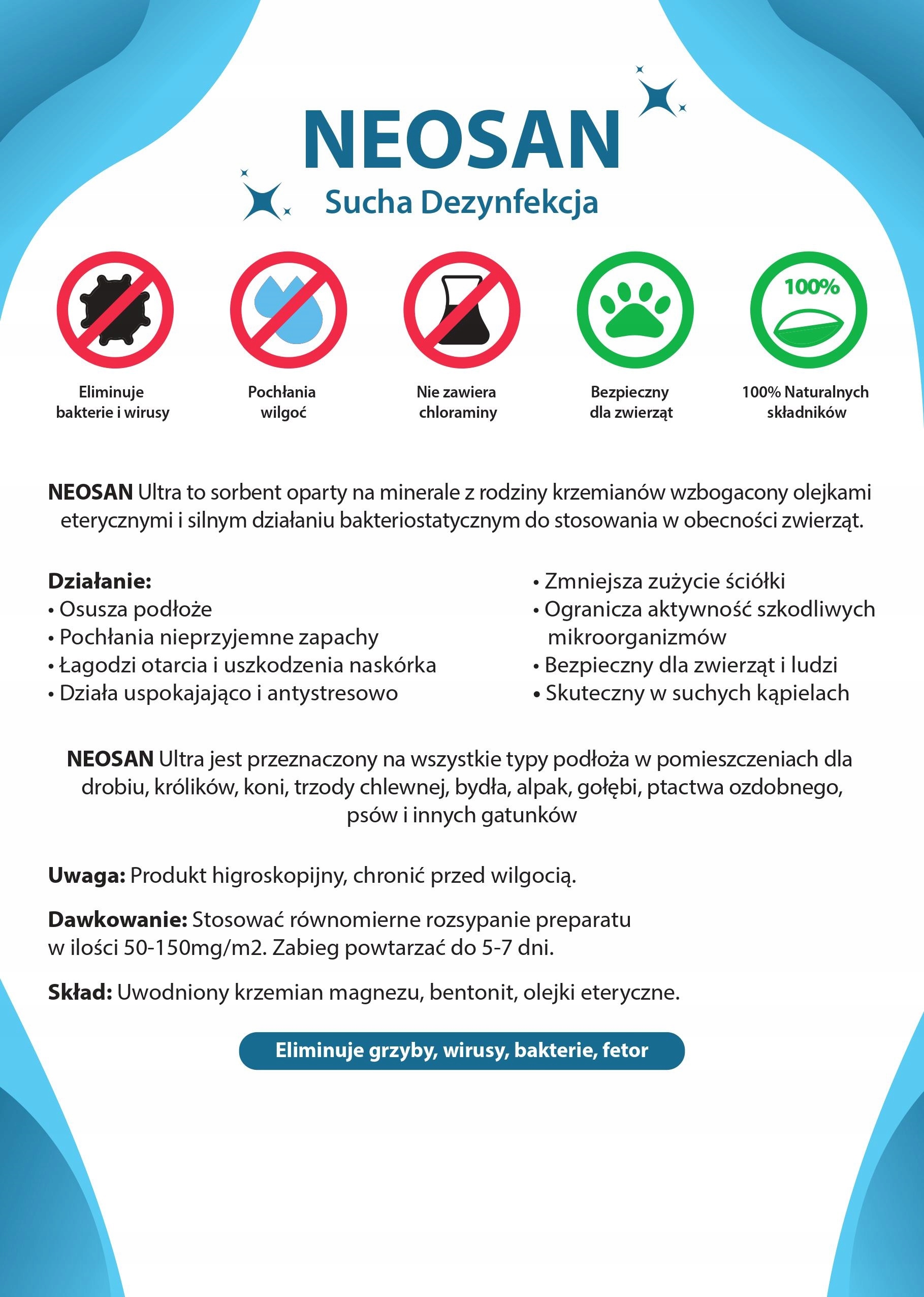НЕОСАН ультрасухая дезинфекция — природный сорбент на основе минералов семейства силикатных, обогащенный эфирными маслами. с сильным бактериостатическим действием.