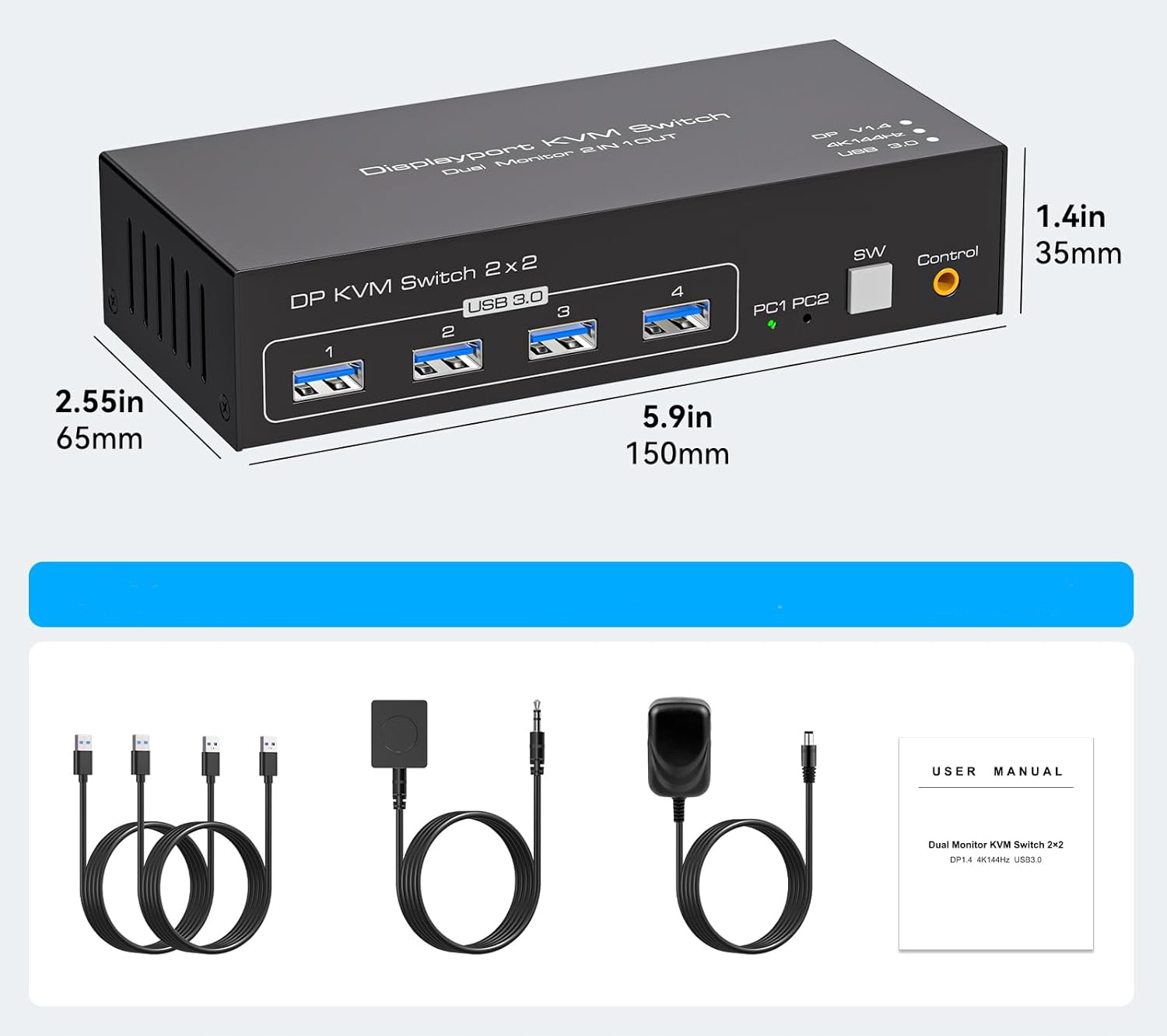 KVM Switch TJCXELE 4K@144HZ DisplayPort, 2 монитора, 2 компьютера, 8K, USB 3.0, 2 порта - для обмена двумя мониторами и 4 устройствами USB 3.0, обслуживание расширенного режима и копирования с контроллером на столе