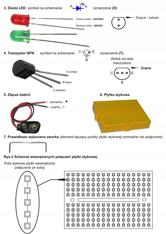 Схема сборки системы напечатана на доске. Необходимо обратить внимание на полярность в случае таких элементов, как конденсаторы, диоды, транзисторы. В случае со светодиодами более длинная ножка – это плюс +, у большинства элементов свои параметры описаны на корпусе. Резисторы могут иметь полосовую маркировку; их сопротивление и допуск можно прочитать с помощью калькуляторов, доступных в Интернете, или измерить с помощью мультиметра. Порядок сборки обычно произвольный, в зависимости от планировки, сначала собираем самые мелкие элементы.