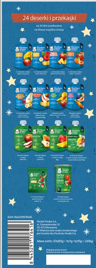 Адвент-календарь Gerber создан для того, чтобы сделать ожидание Рождества еще более радостным и... вкусным, особенно для самых маленьких членов семьи. Это первый и единственный календарь в Польше, полный интересных вкусов без добавления сахара*, каждый из которых соответствует строгим стандартам качества продуктов питания для младенцев и маленьких детей. Там, среди прочего, малыши найдут