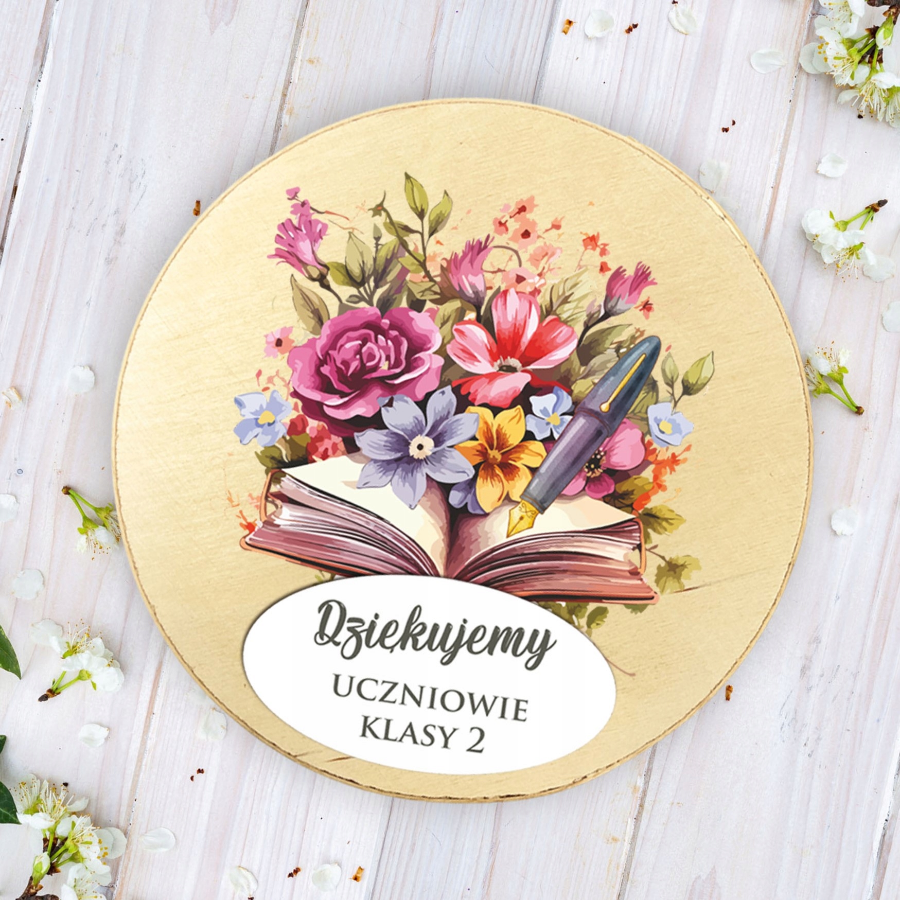 Целое тщательно помещается в круглую коробку, наполненную экологическими белыми чипсами. В коробке есть красочная печатная и деревянная персонализация (текст посвящения - спасибо и ученики класса).