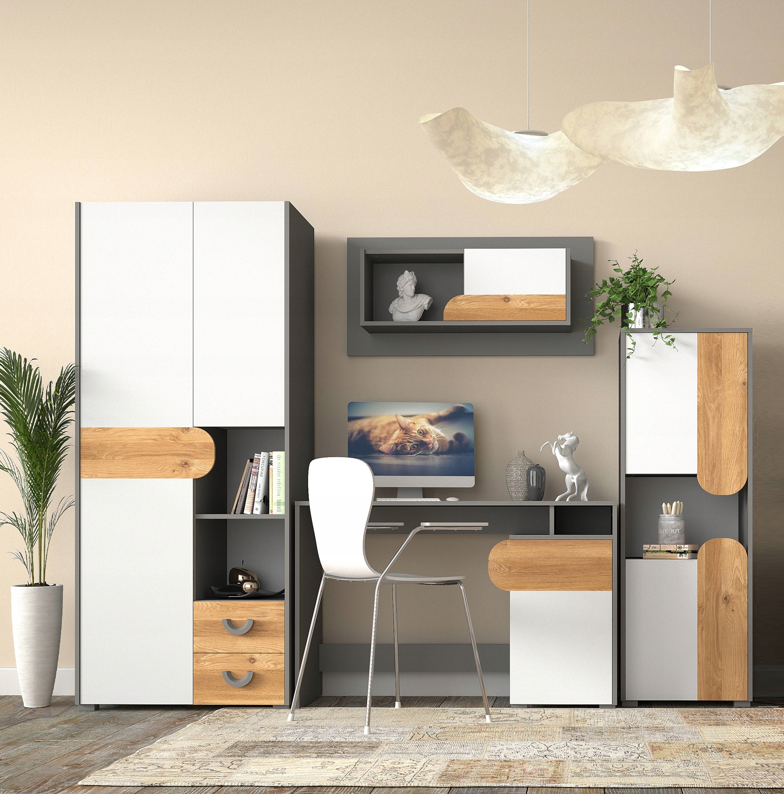 В состав системы входят: шкафы, полки, комод, письменный стол, полки, прикроватная тумбочка, кровать