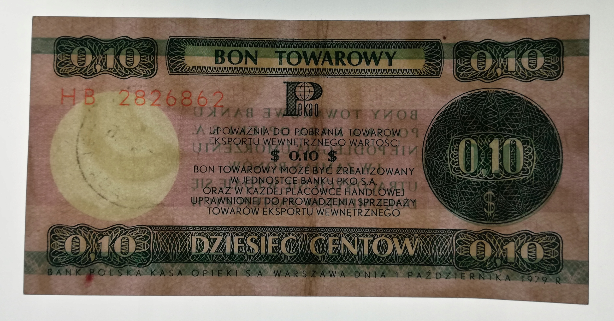 - Описание номинала: Маленький ваучер Pewex серии HB номиналом 10 центов 1979 года.