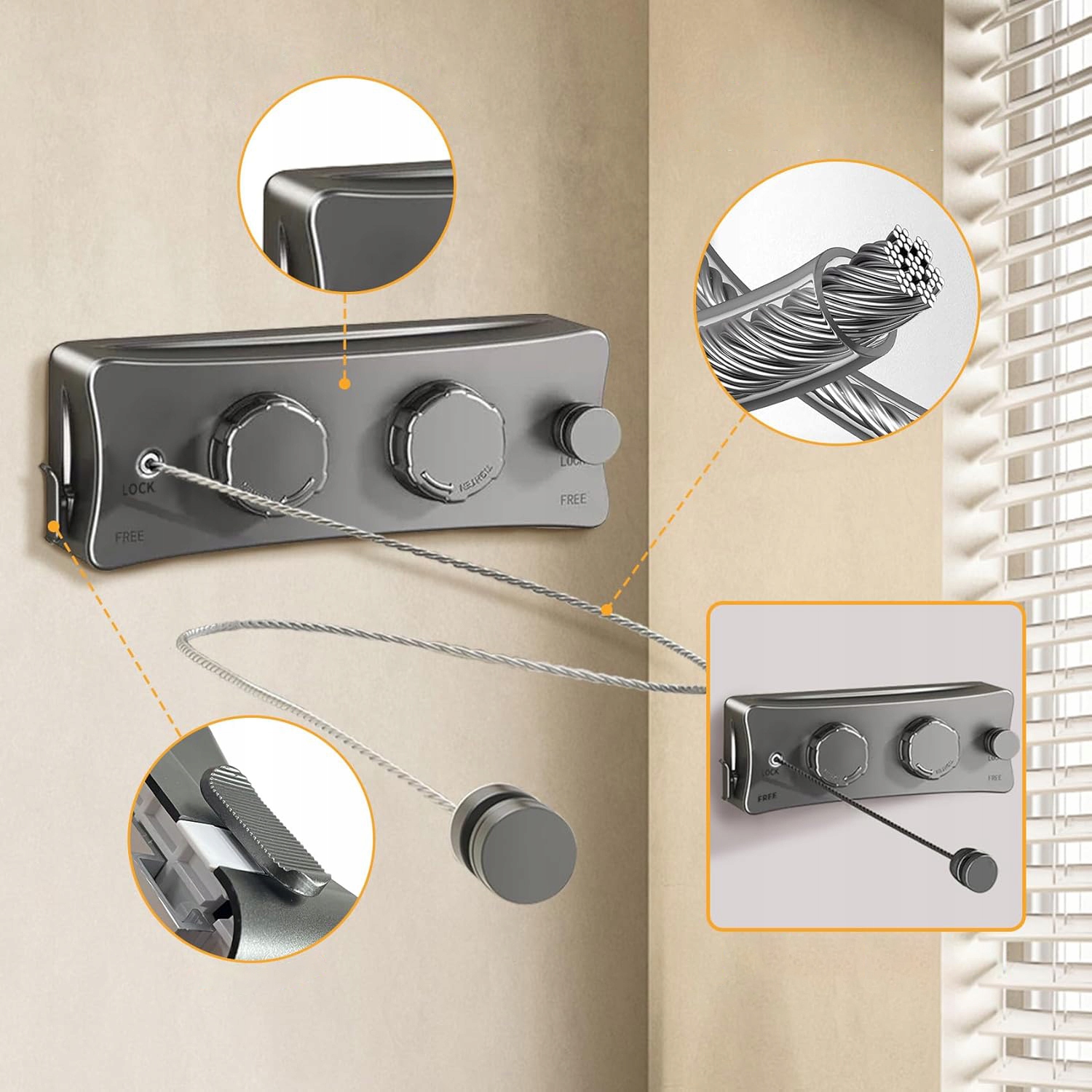 Основание сборки изготовлена из прочного алюминия, что обеспечивает точное соответствие стене и исключительную стабильность после установки. Даже при сушке много тяжелой одежды и значительного напряжения основание остается безопасно прикрепленным к стене, предотвращая катание или ослабление кабеля. Более того, бремя одежды не позволяет кабелю двигаться или падать, эффективно устраняя проблему раскачивания традиционных линий под нагрузкой.