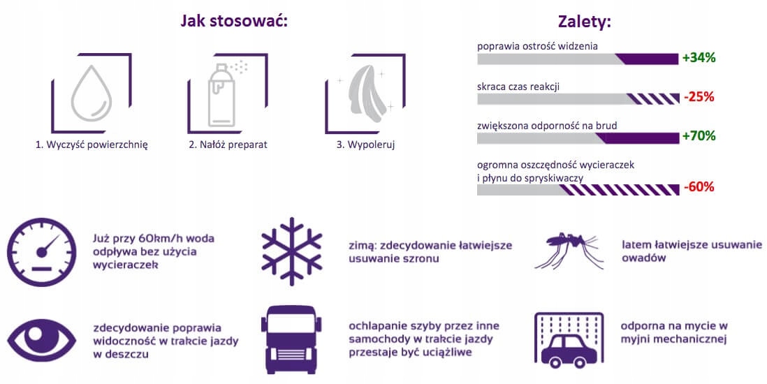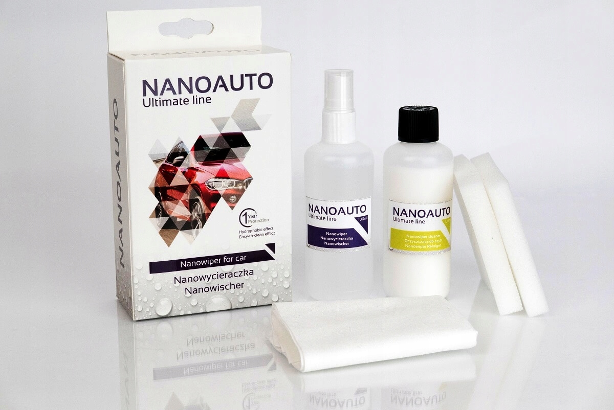 NANOAUTO WIPER — высококачественный продукт для пропитки стеклянных поверхностей. Благодаря химической реакции, которая происходит между частицами размером в несколько нанометров и стеклом, мы получаем гидрофобный эффект (отталкивание молекул воды). Кроме того, стекло становится гораздо более устойчивым к разного рода загрязнениям (например, насекомым, грязи). Зимой это значительно облегчает размораживание замерзших окон. Нано-стеклоочиститель также устойчив к мытью на механической мойке.
