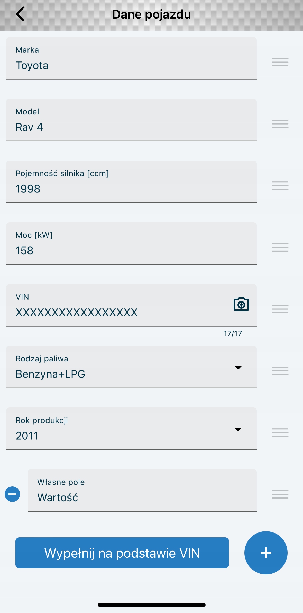 При создании отчета вы можете внести необходимые данные об автомобиле. Вы можете создать 10 дополнительных текстовых полей, которые позволят вам добавить любую информацию о транспортном средстве. Значок кнопки позволяет изменить порядок отображения текстовых полей. Версия Pro Carbon позволяет вам считывать вин-номер с помощью камеры вашего телефона и заполнять данные об автомобиле одним щелчком мыши, что значительно сократит время, необходимое для заполнения данных.