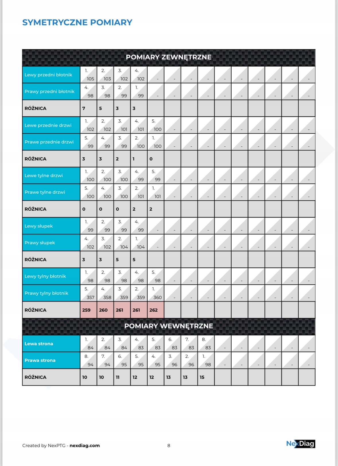 Дополнительным преимуществом отчета являются симметричные измерения, при которых сравнивается один и тот же элемент автомобиля с левой и правой стороны. Приложение автоматически сравнивает замеры и оформляет их в виде таблицы, благодаря чему вы можете представить покупателю различия в толщине замеров различных элементов автомобиля.