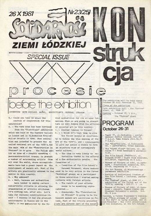 Необычное приложение к журналу «Солидарность Лодзинской земли». 1981. № 23(25) (26.10.1981) посвящён знаменитой международной выставке современного искусства: Строительство в процессе 1981 27 октября. - 10 ноября 1981 года в Лодзи по адресу ул. PKWN (позже Dowborczyków) 37. Выставка, инициированная Рышардом Васко, в тексте интервью с ним, а также программа выставки. Частью проекта также стала выставка «Польское искусство 1970–1980 годов».