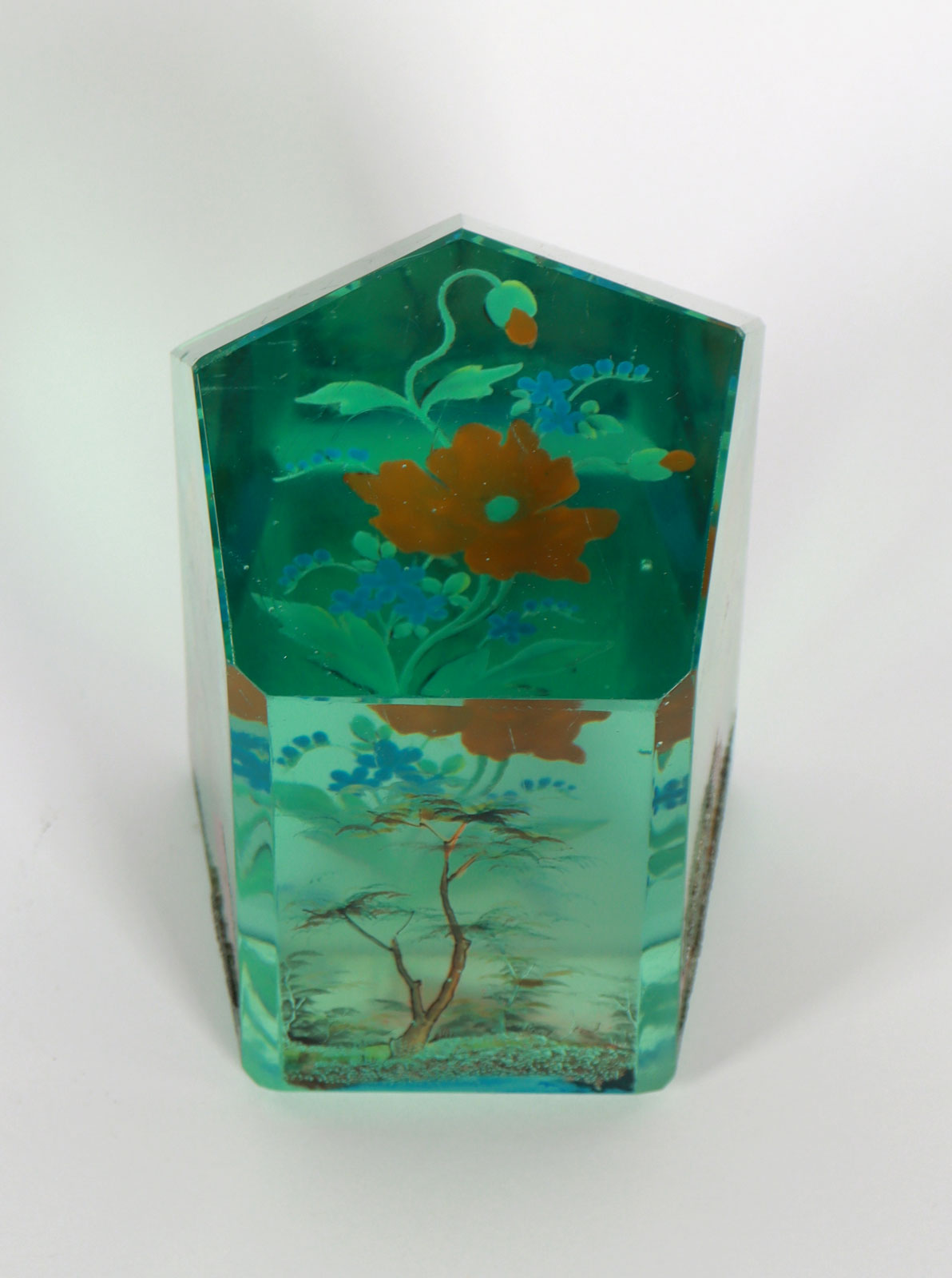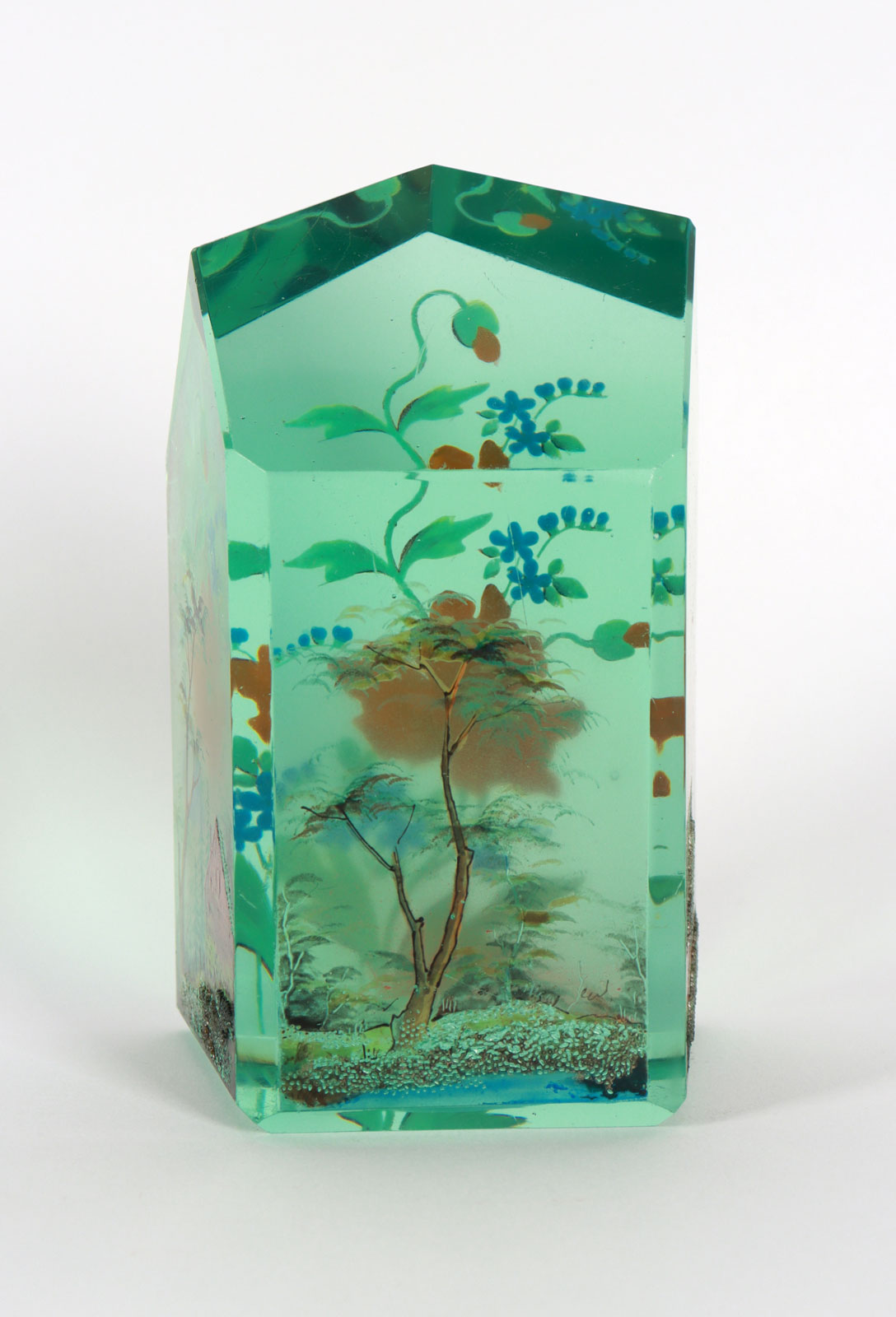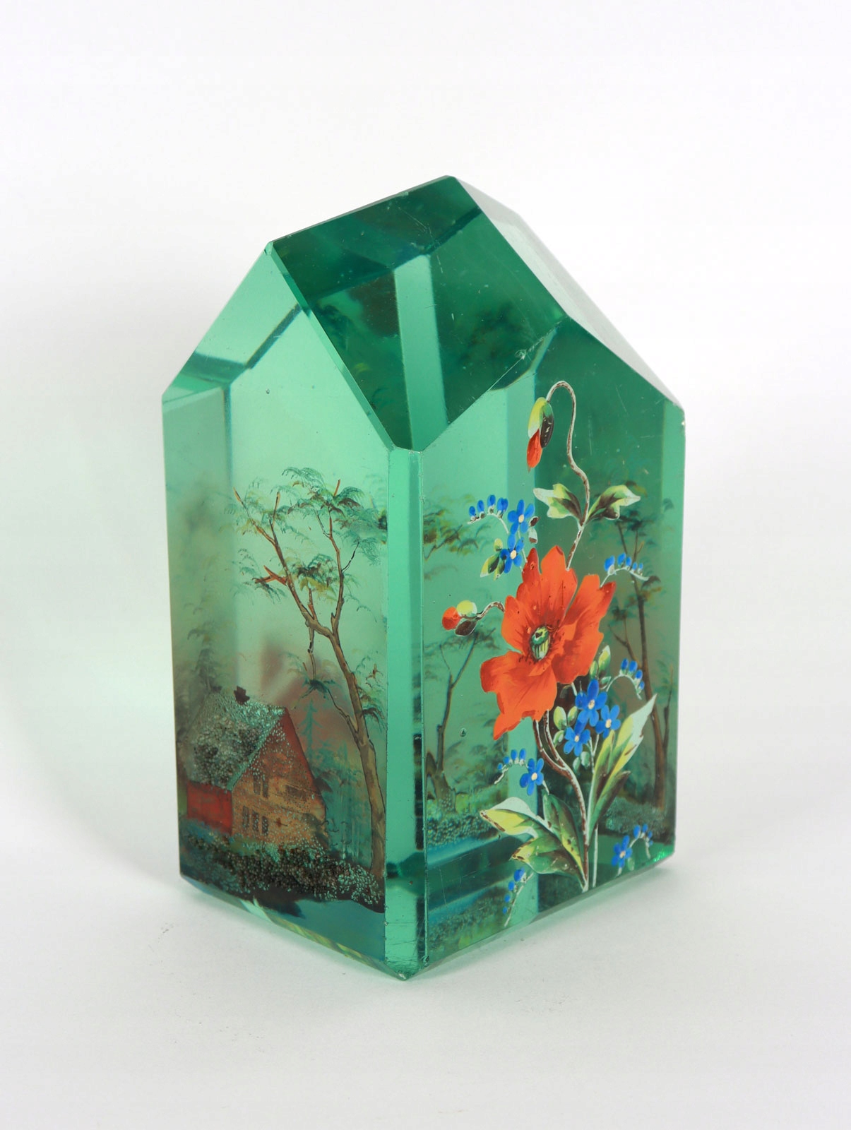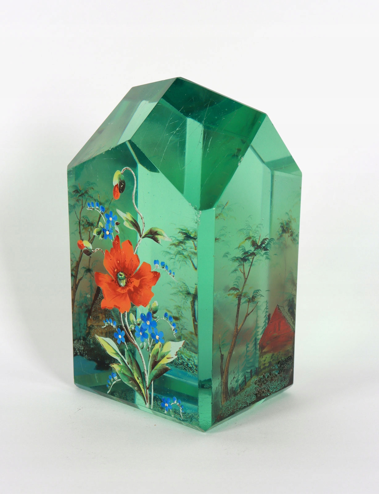 прессы в форме призмы из свинцового стекла. края стен передаются вручную. Фронт украшен цветочным мотивом, окрашенными эмалевыми красками - ручная живопись. Другие стороны с ландшафтным мотивом.