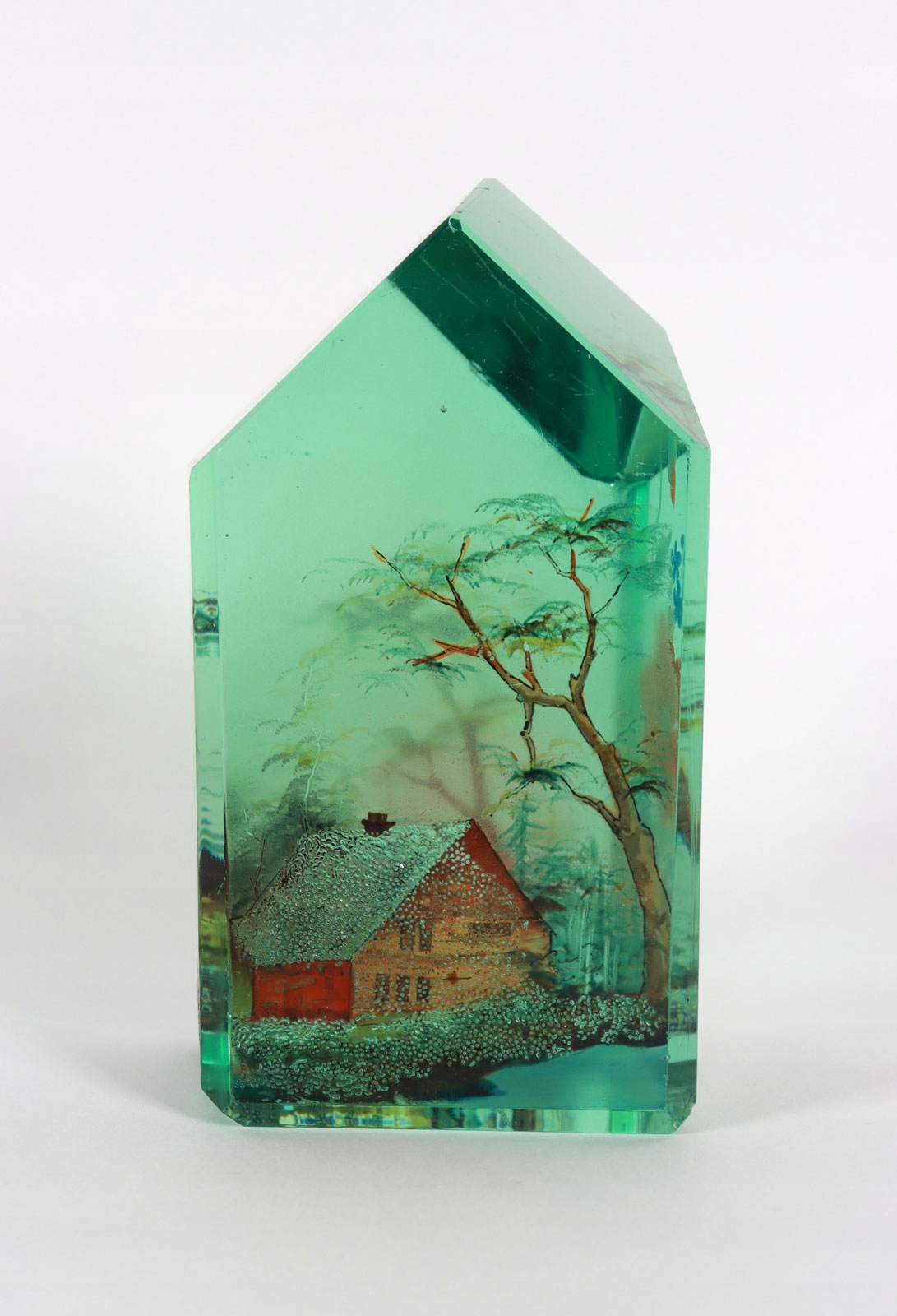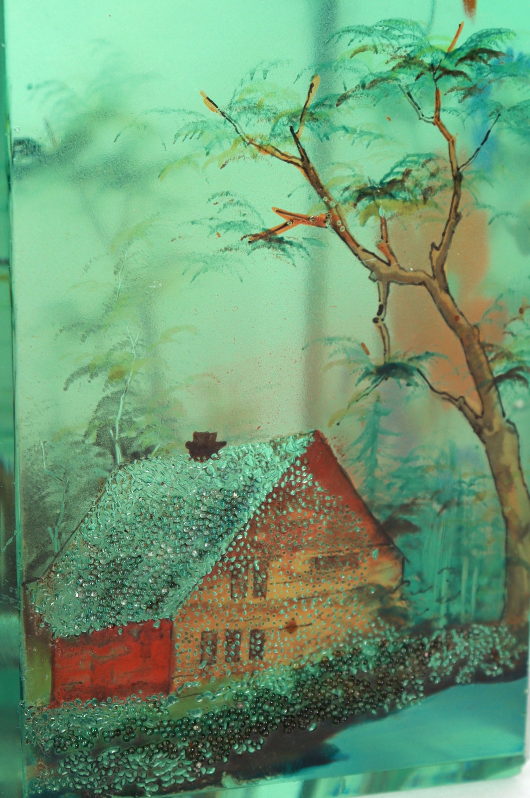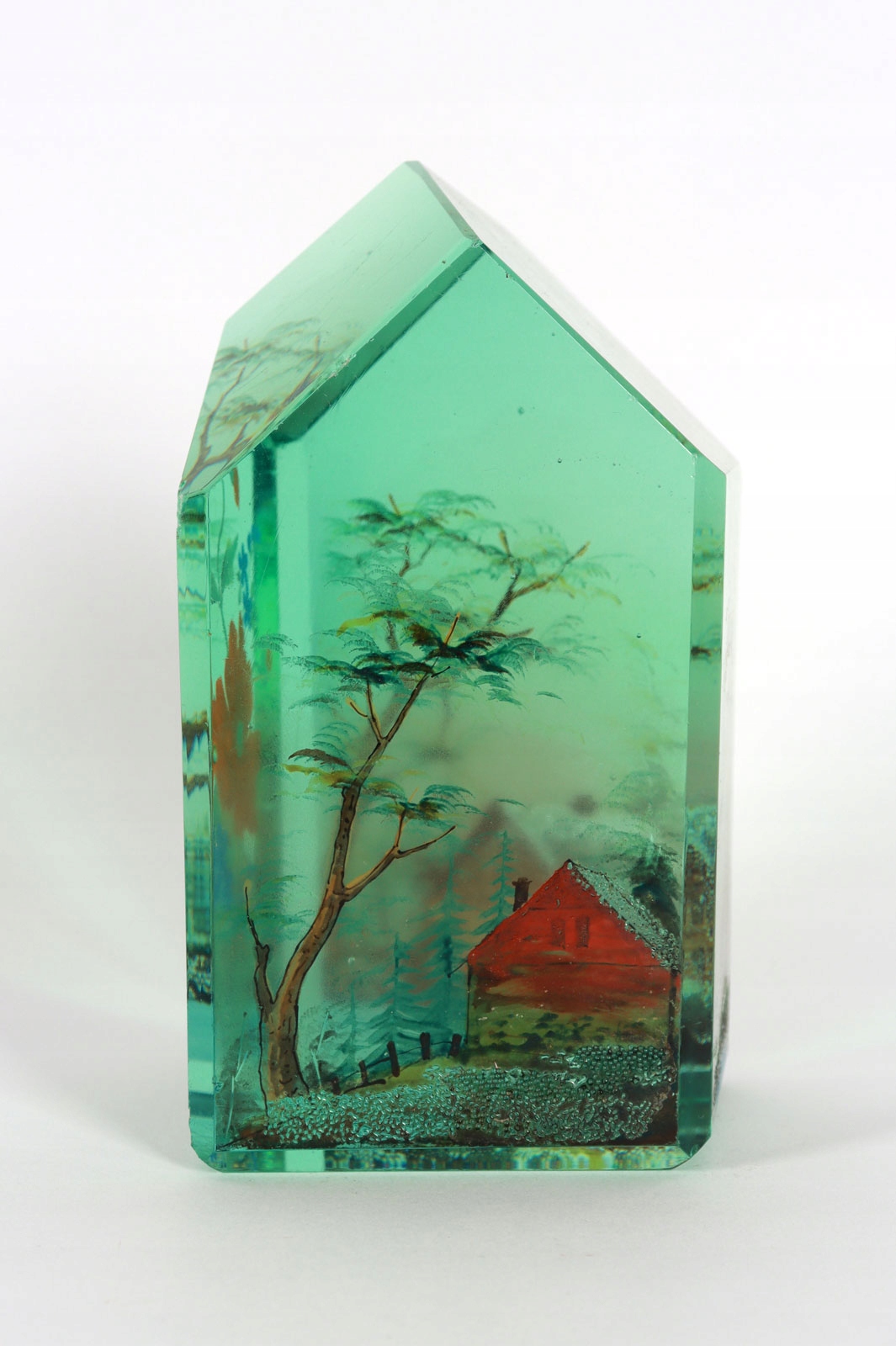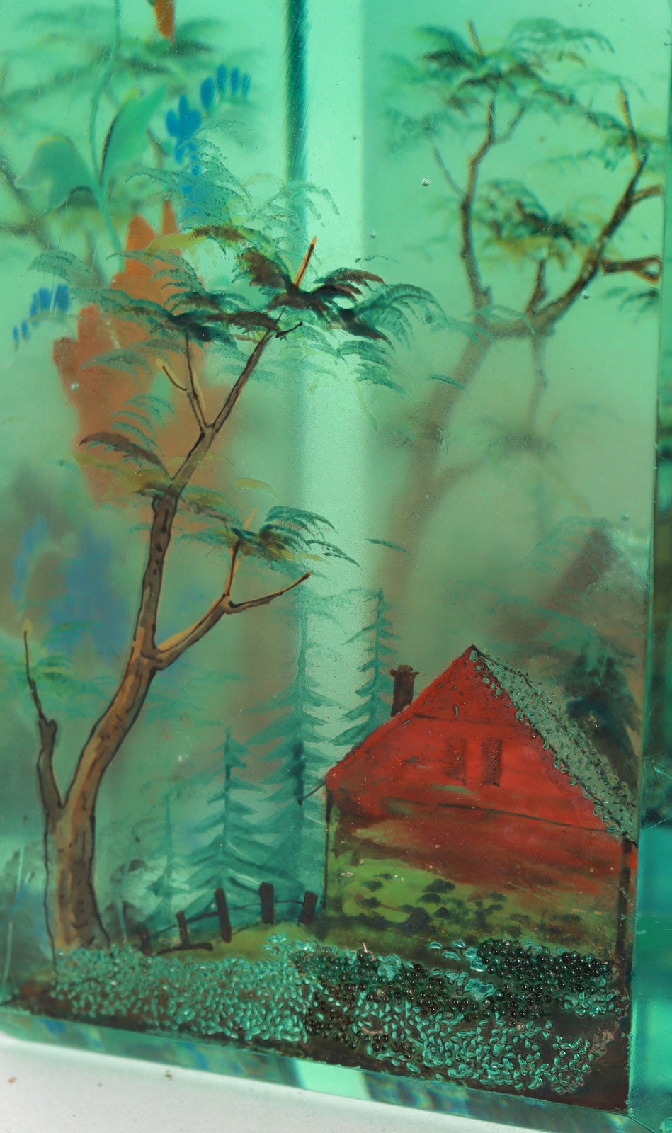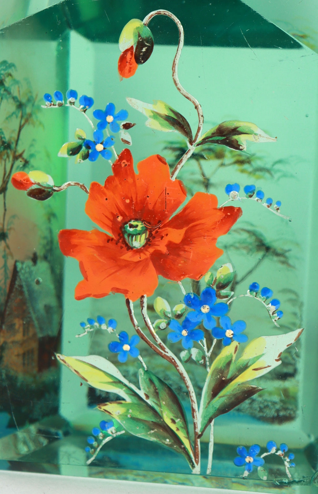 прессы в форме призмы из свинцового стекла. края стен передаются вручную. Фронт украшен цветочным мотивом, окрашенными эмалевыми красками - ручная живопись. Другие стороны с ландшафтным мотивом.