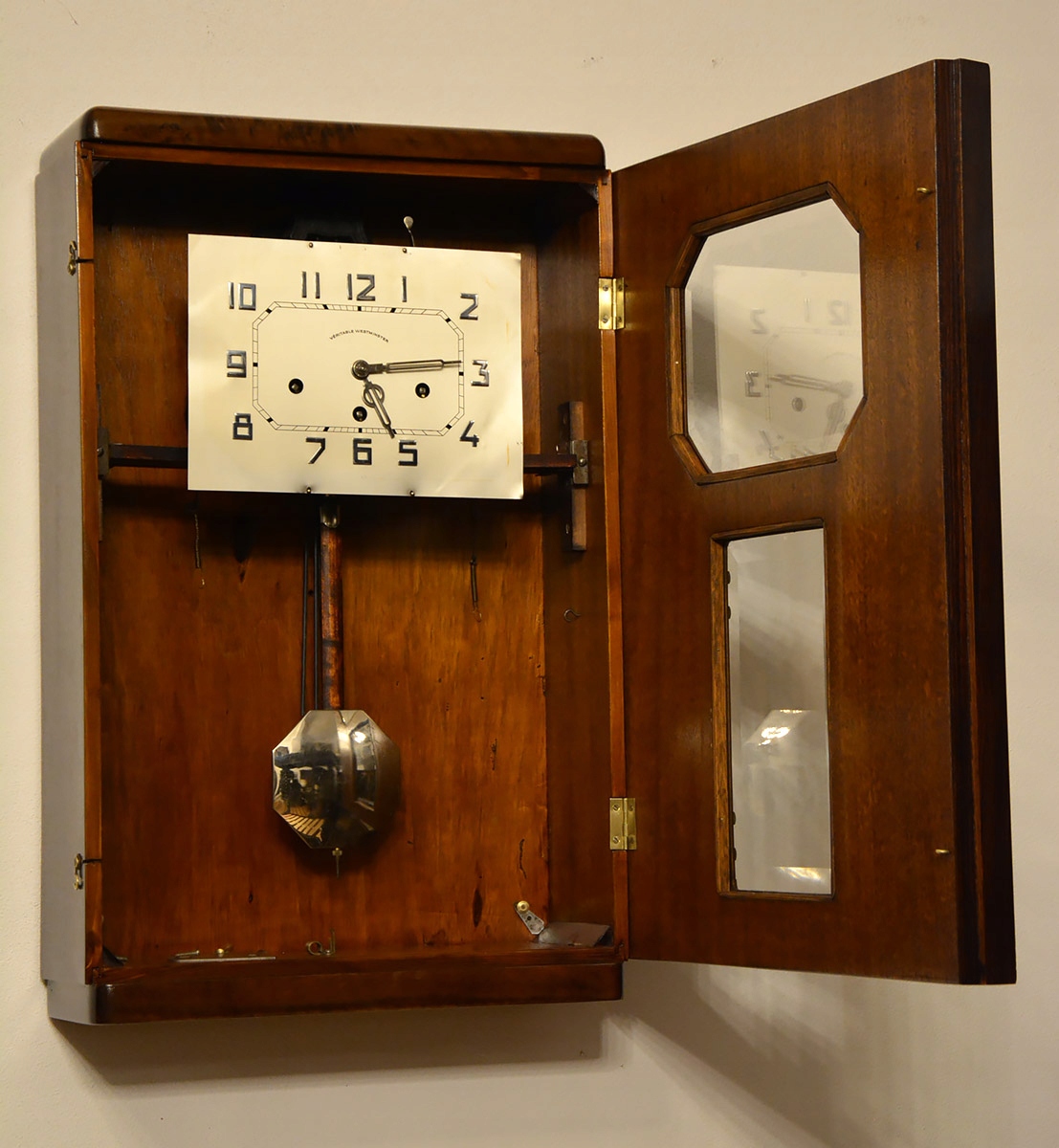 Циферблат с хромированными арабскими метками и красивыми стрелками. Восьмиугольный маятник, также хромированный.