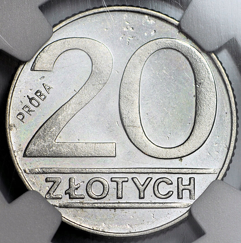 Очень небольшой тираж технологических пруфов номиналом 20 злотых 1989 года, отчеканенных в медно-никелевом сплаве, был разделен на несколько разновидностей, что делает каждую из этих пруфов еще более редкой!
