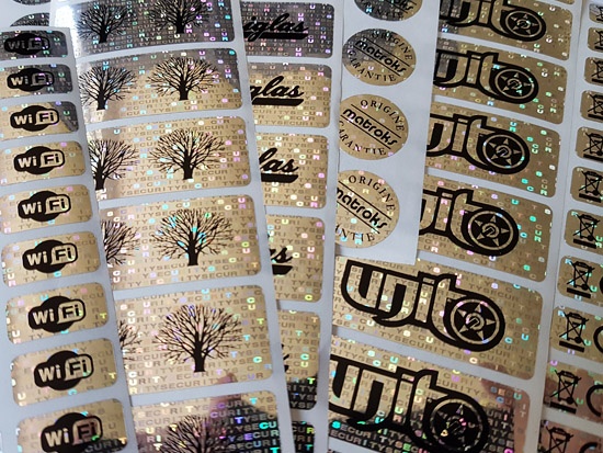 После отделения на этикетке появляется надпись VOID. Голограммы также оставляют надписи на защищаемом предмете. Фольга проводит электричество и поэтому не пригодна для использования на печатных платах и электронных компонентах. Устойчив к атмосферным и химическим факторам. Идеально подходит для приклеивания на плоские и слегка изогнутые поверхности, а также в местах стыков различных элементов. Перед нанесением герметика загрязненные поверхности следует очистить и обезжирить. Клей полностью затвердевает и становится полностью работоспособным в течение 24 часов. от наклеивания этикетки.