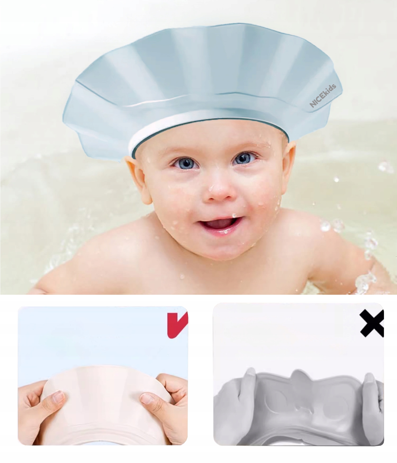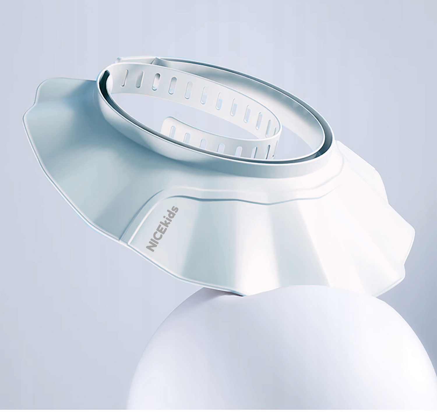 Поля ванны NICEkids PREMIUM регулируются и идеально подходят для головы ребенка разного размера. Удобная застежка не только обеспечивает легкое и быстрое надевание, но и удерживает козырек на месте во время купания.