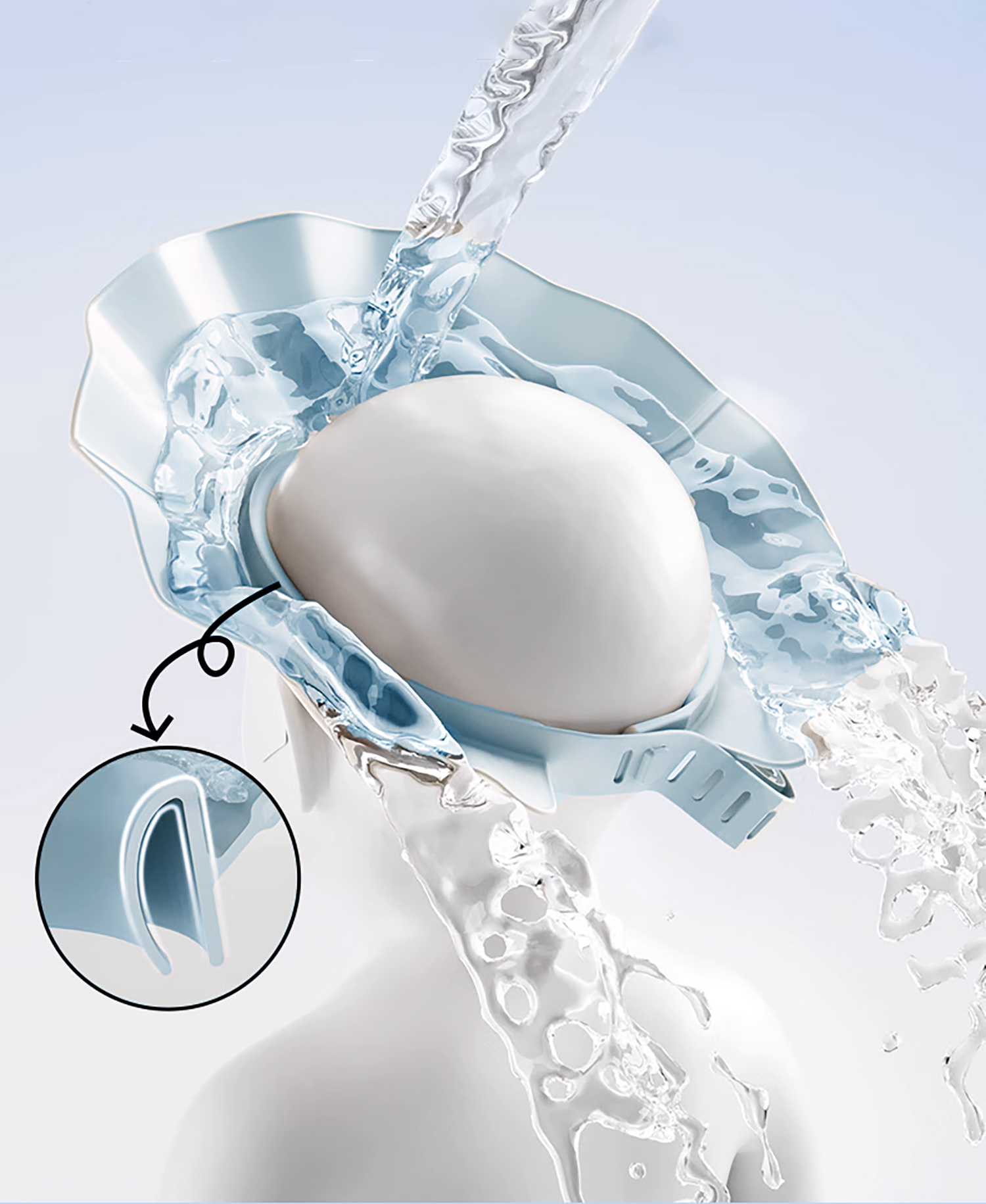 Благодаря специально разработанной запатентованной конструкции и комбинации двух материалов (жесткой крыши и мягкого силикона) козырек защитит глаза, уши и лицо вашего ребенка от воды и шампуня. Нежная синяя отделка придает нашему изделию шарм и элегантность.