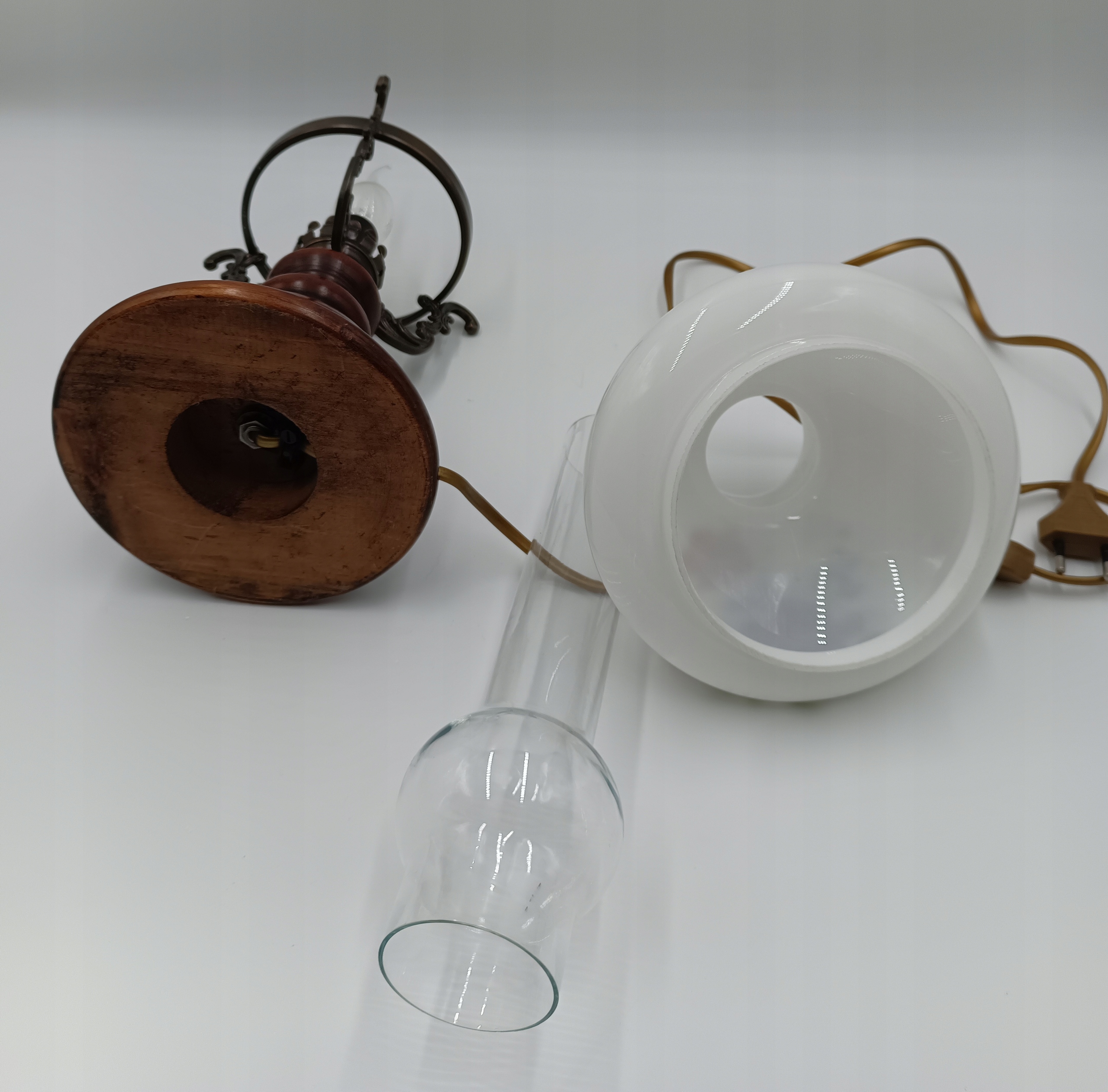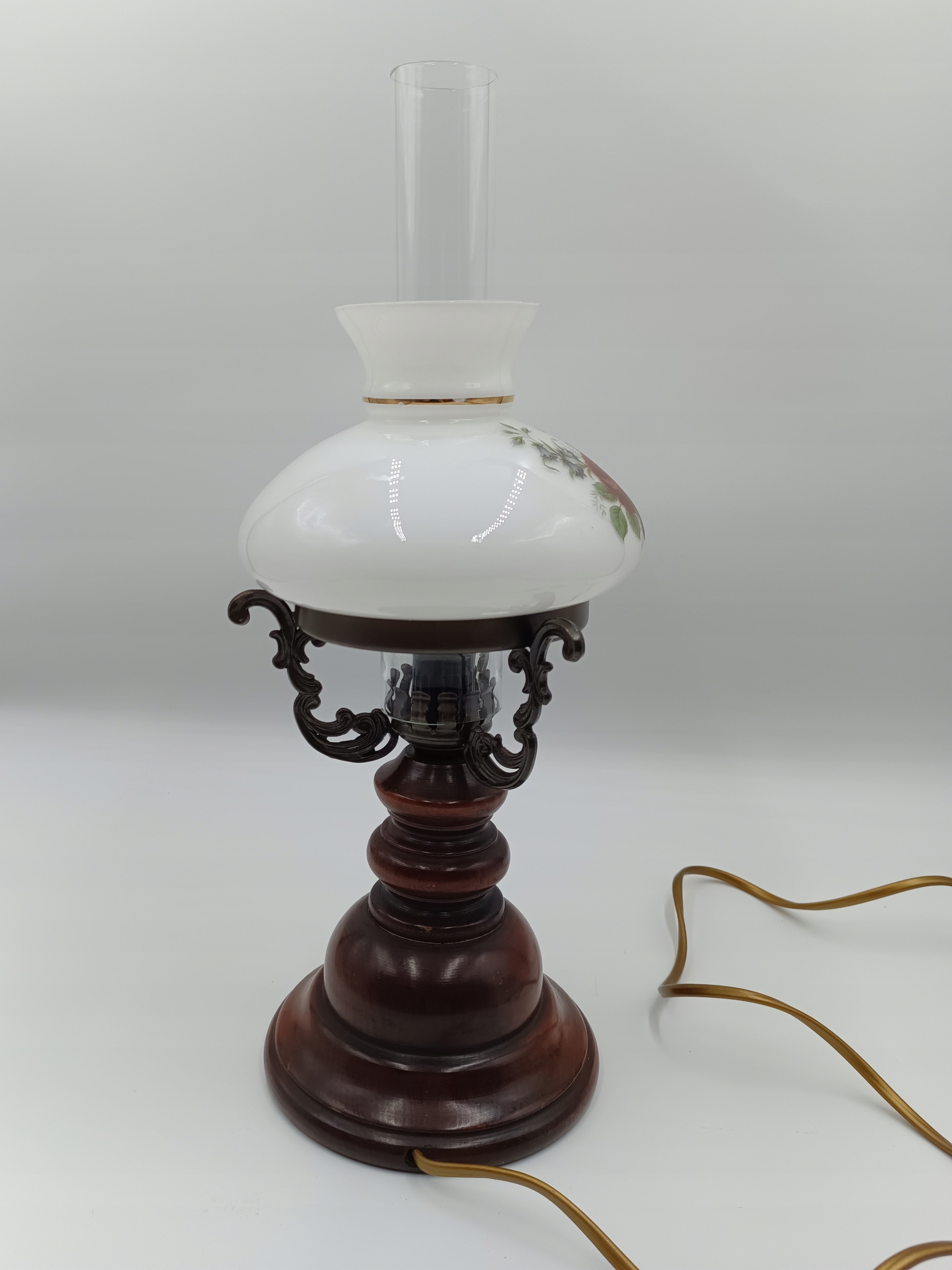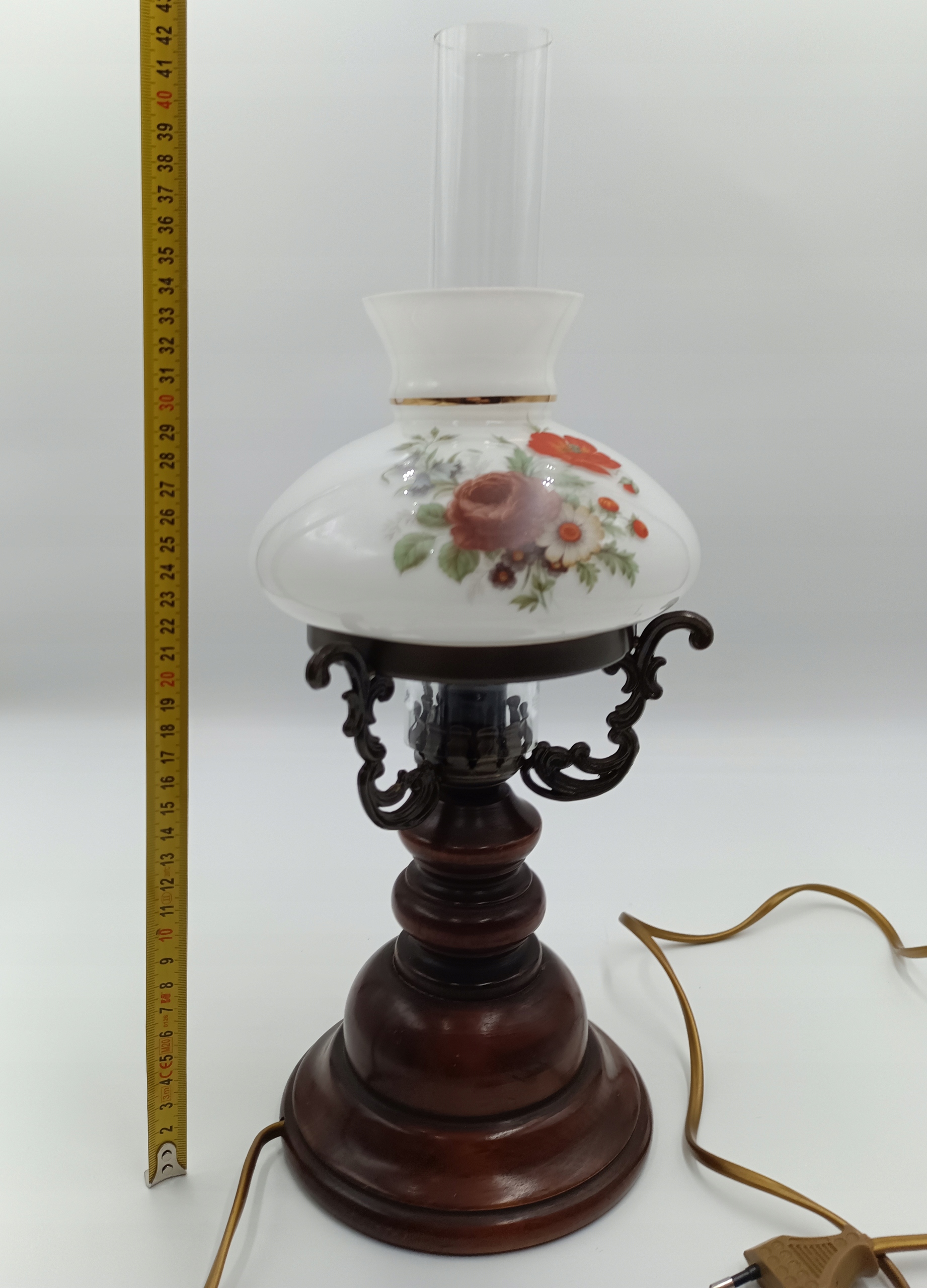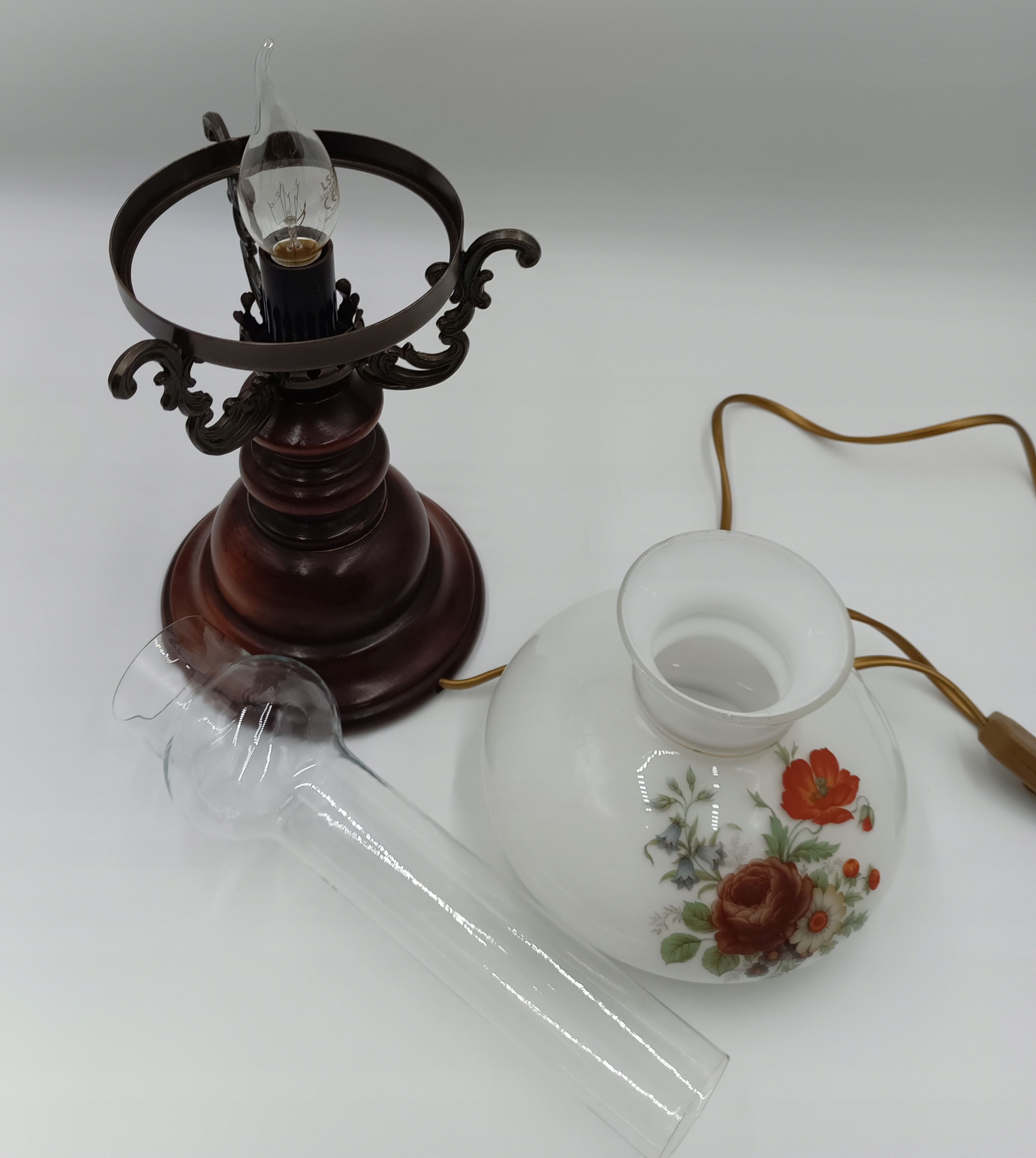 • нога из деревянной/латунной рамы, 2 стеклянного абажура, очень красивые, красивые цветы на внешнем абажуре,