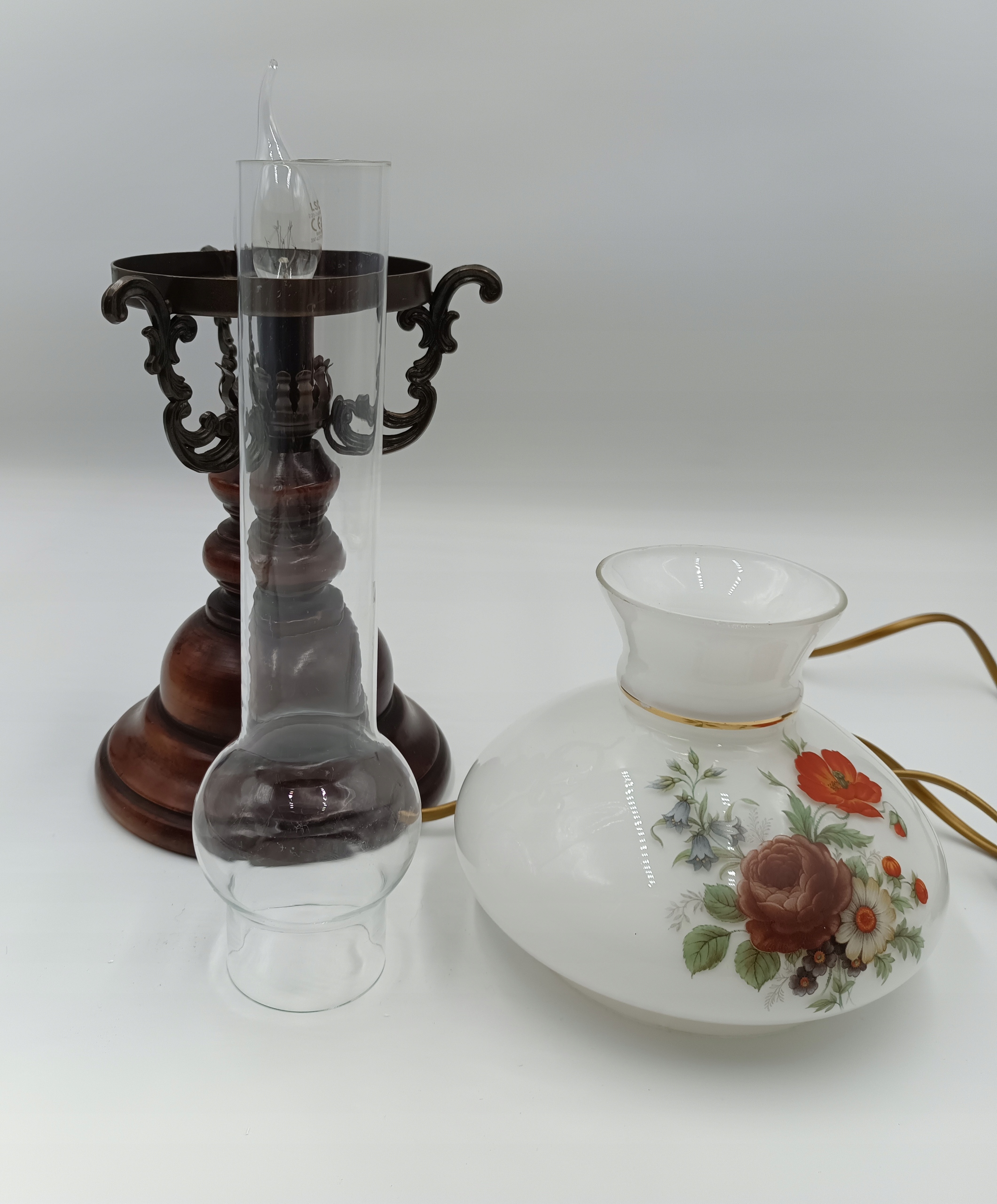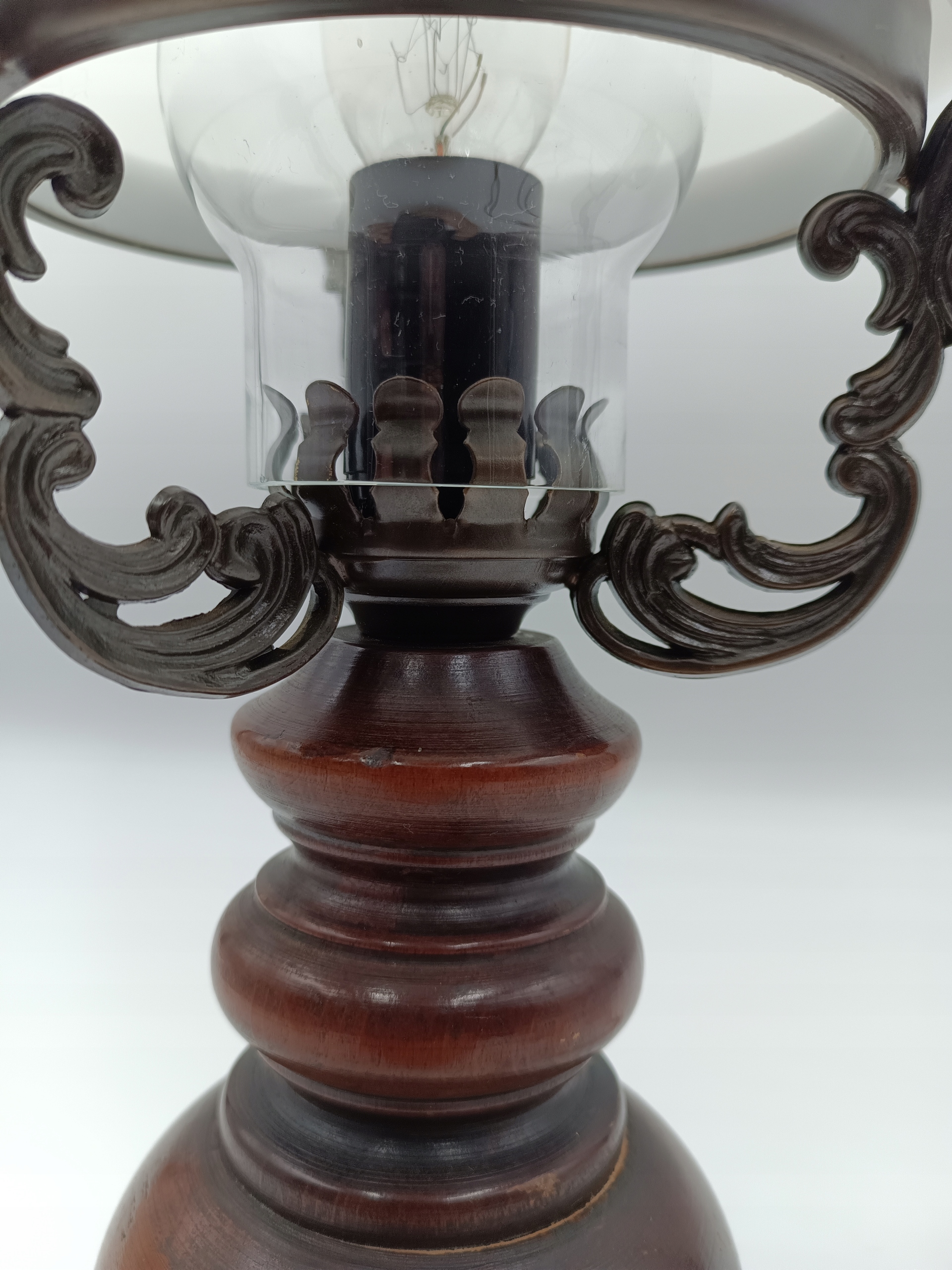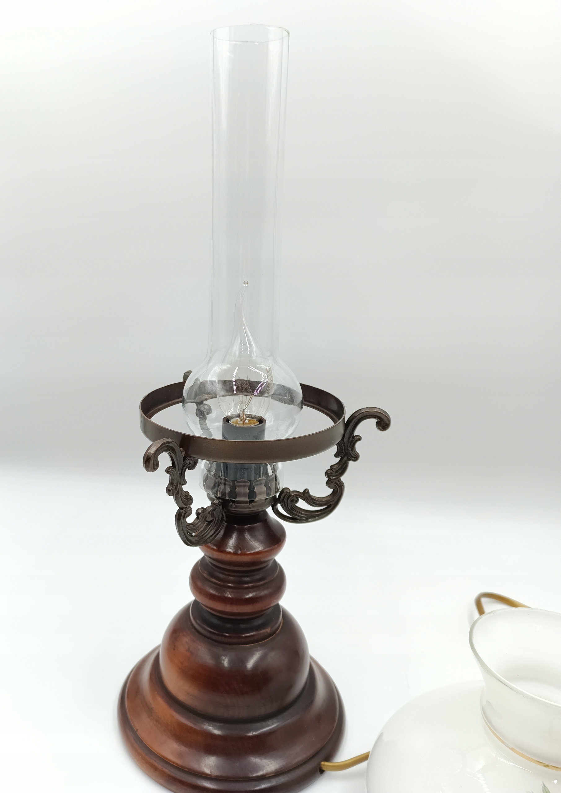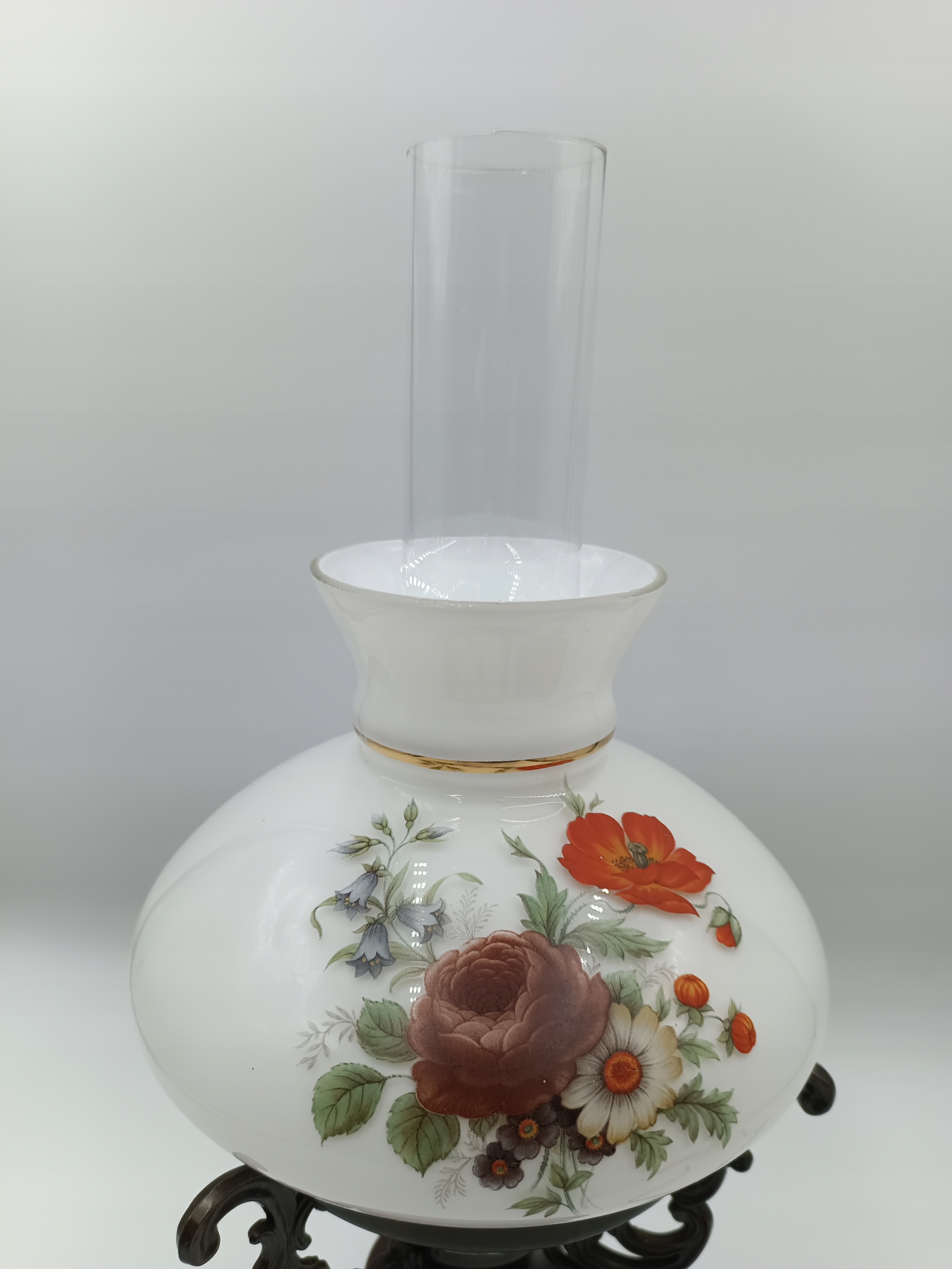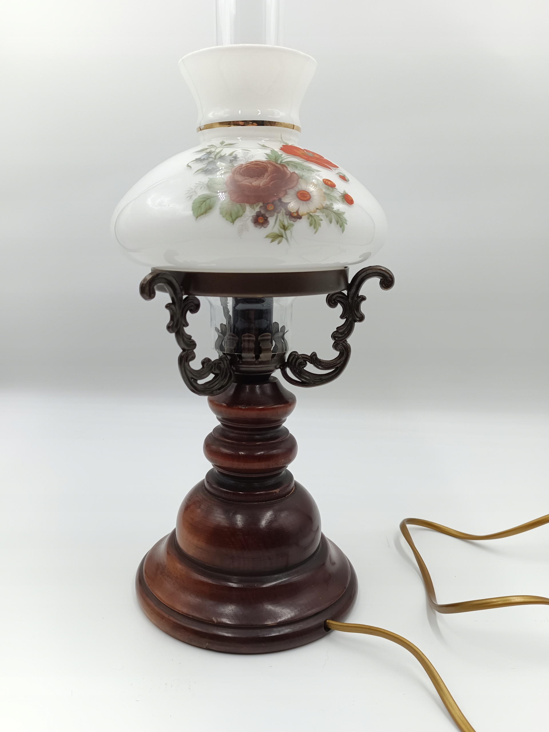 • нога из деревянной/латунной рамы, 2 стеклянного абажура, очень красивые, красивые цветы на внешнем абажуре,