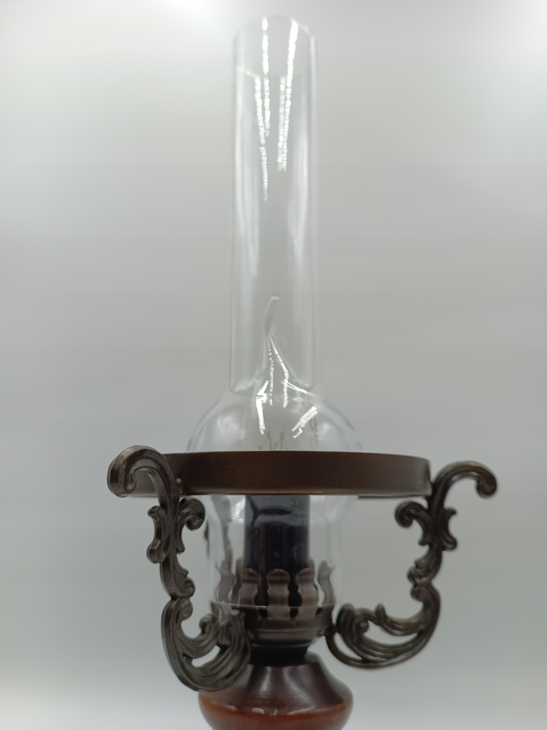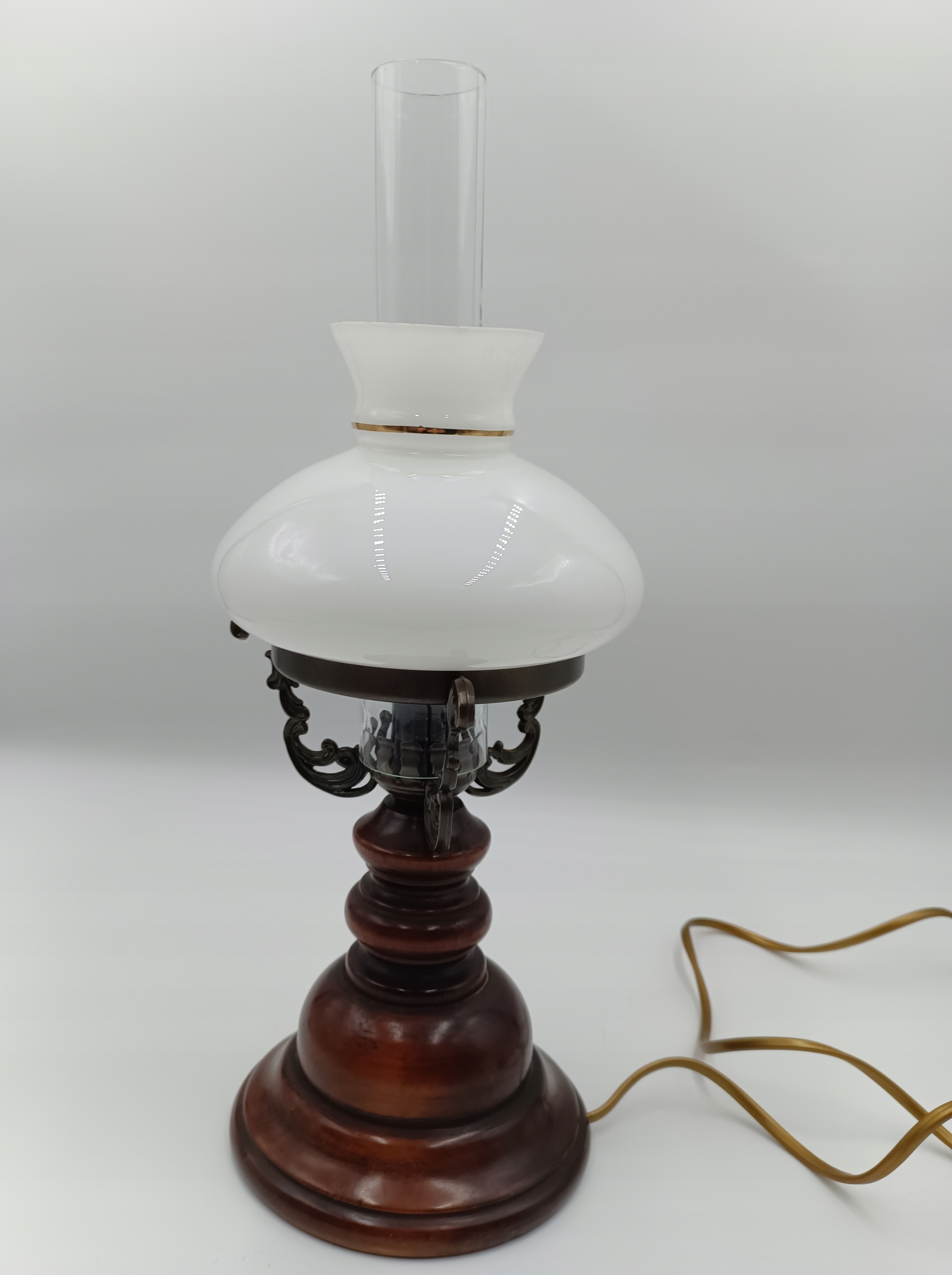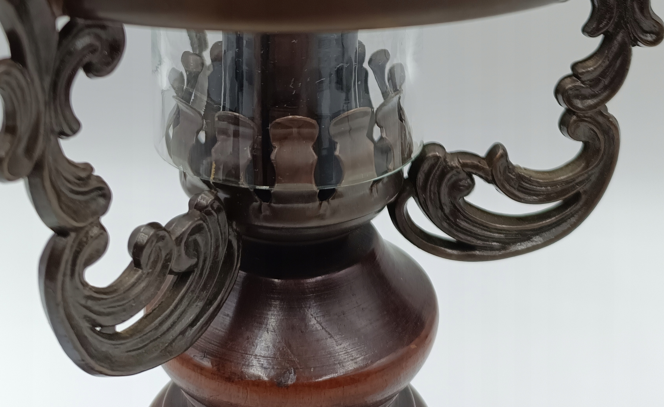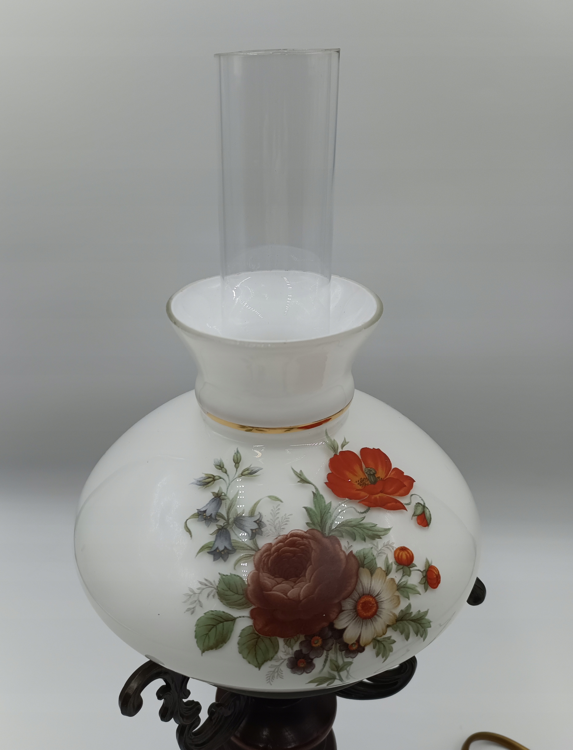 • нога из деревянной/латунной рамы, 2 стеклянного абажура, очень красивые, красивые цветы на внешнем абажуре,