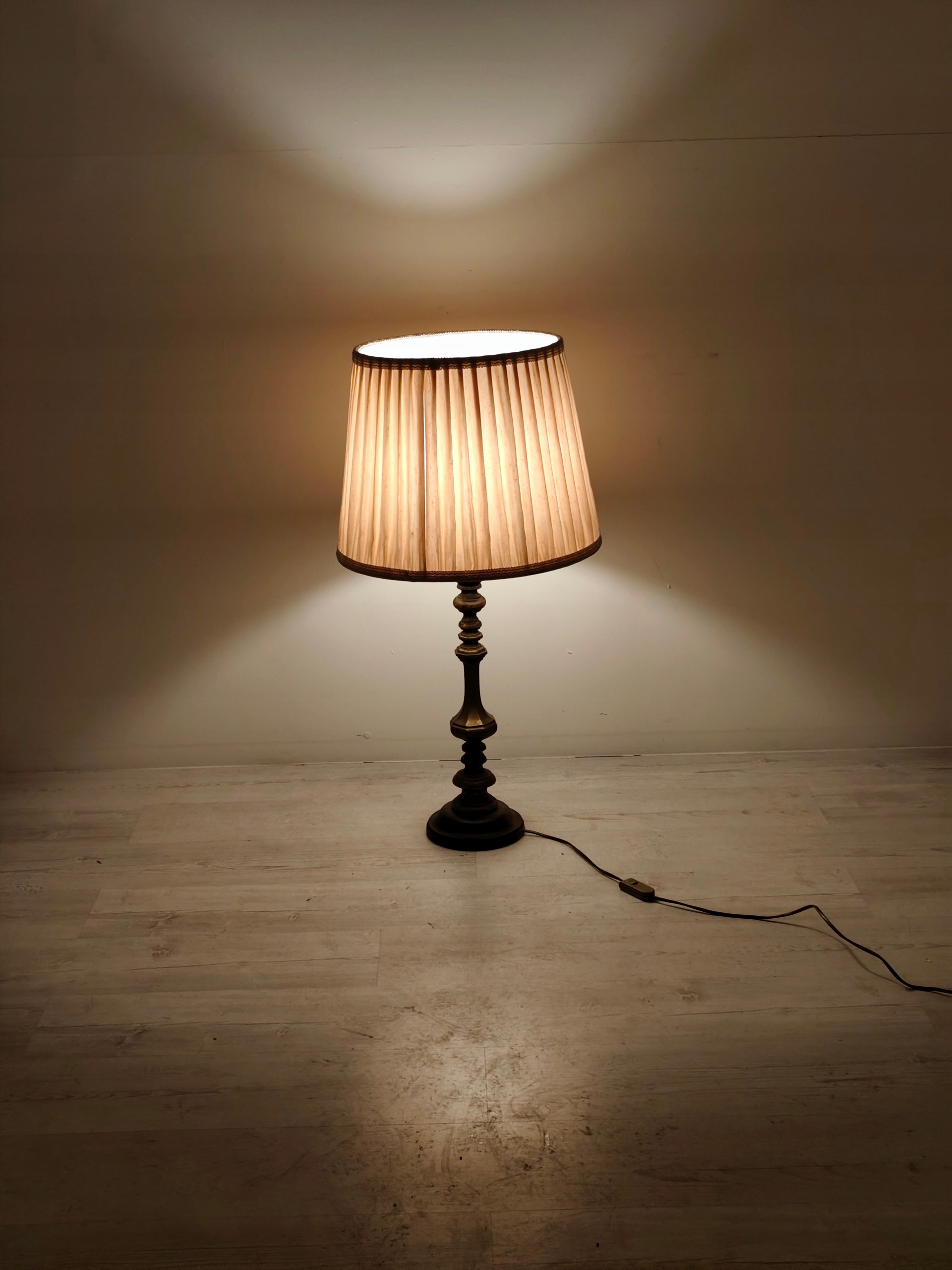 Настольная лампа антикварный с точеным основанием, из дерева и латуни, с плиссированным абажуром цвета экрю.