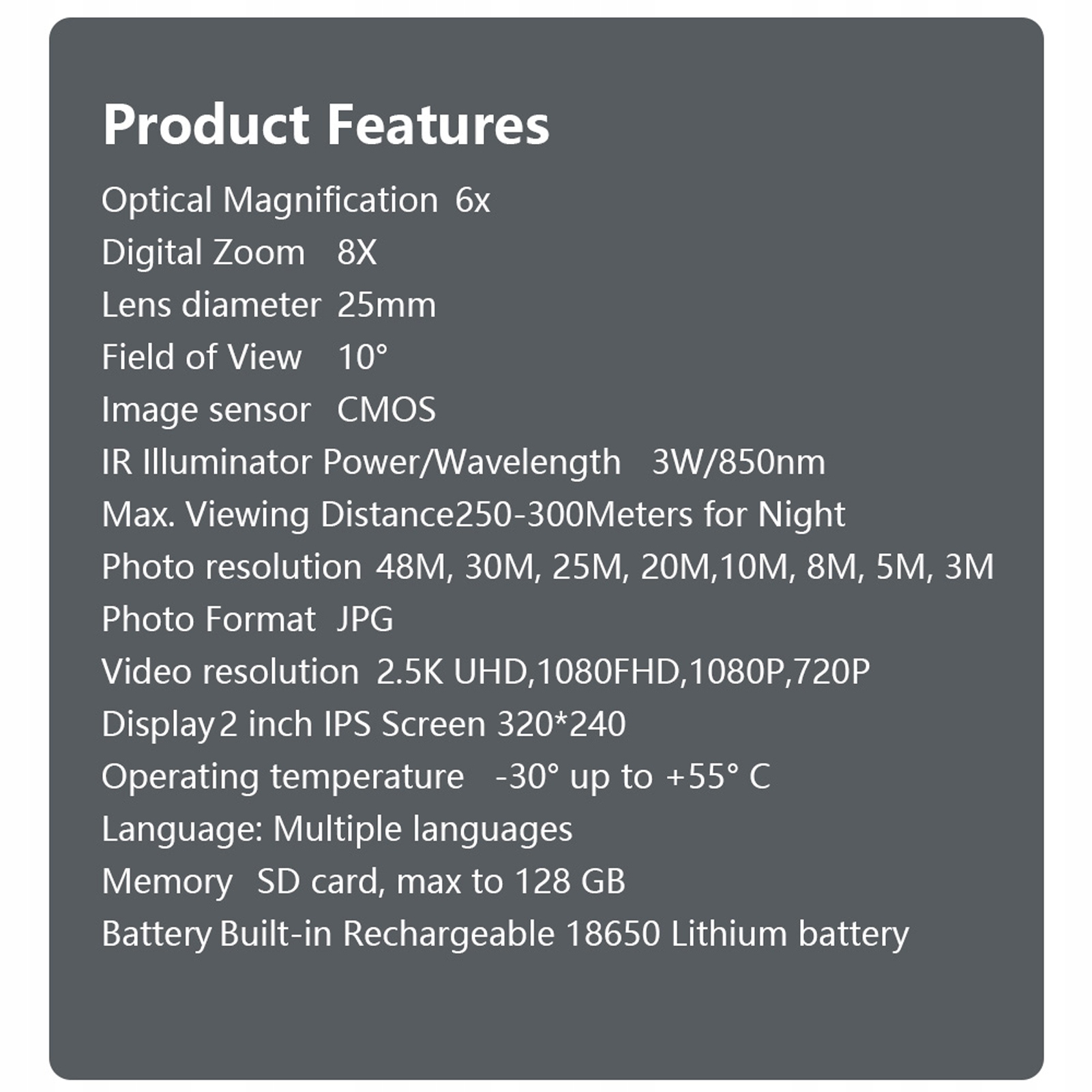 3. 8x цифровой масштаб: увеличение до 8 раз, чтобы запечатлеть сложные детали отдаленных тем, увеличивая ночные наблюдения.