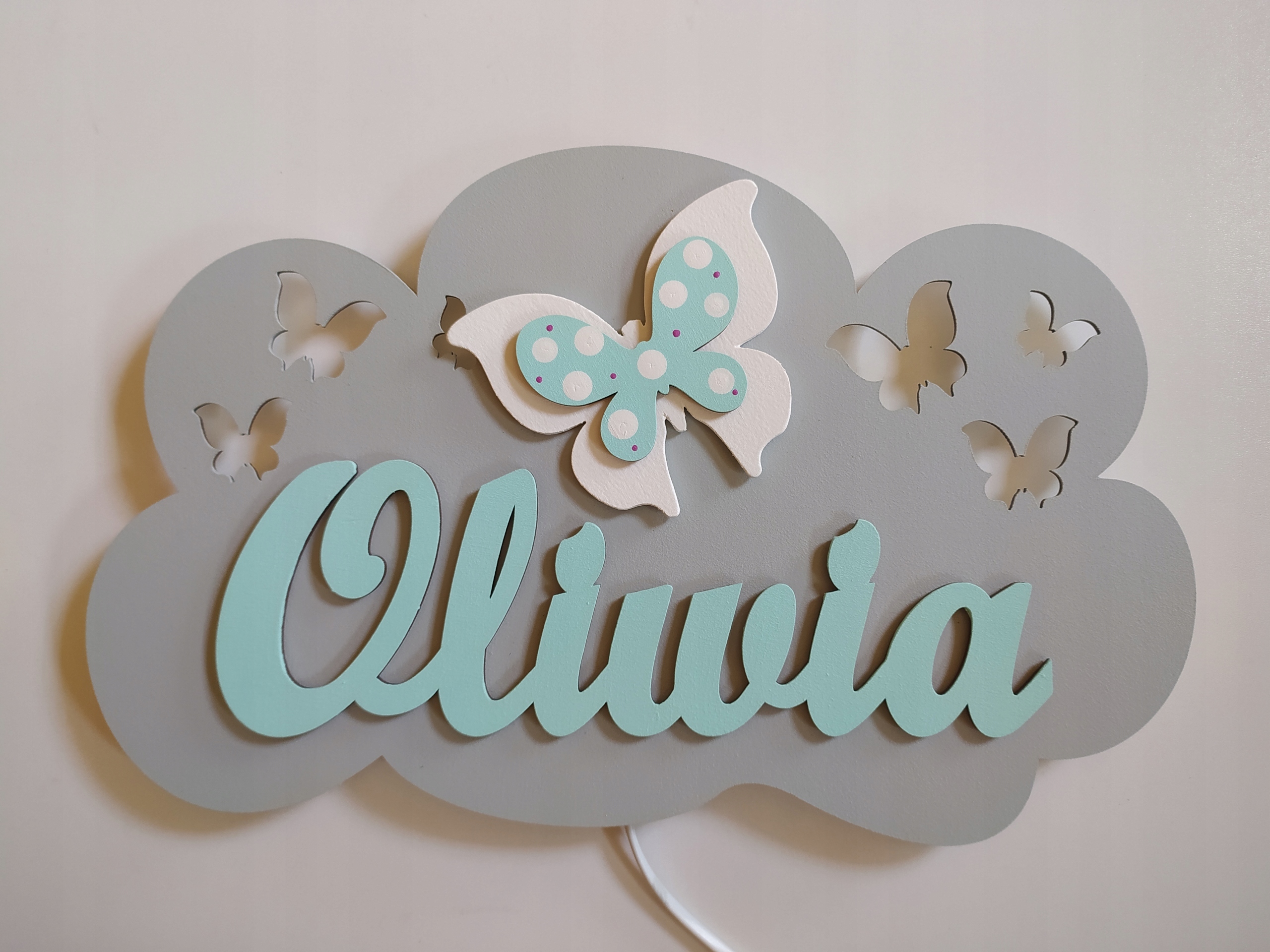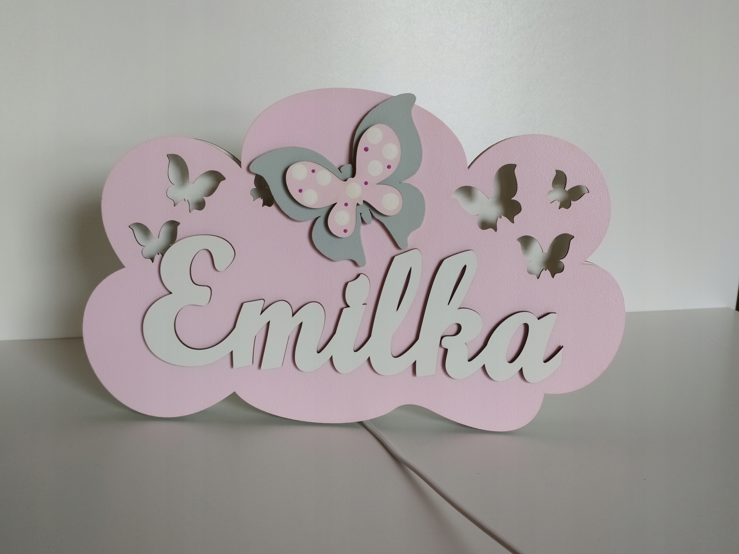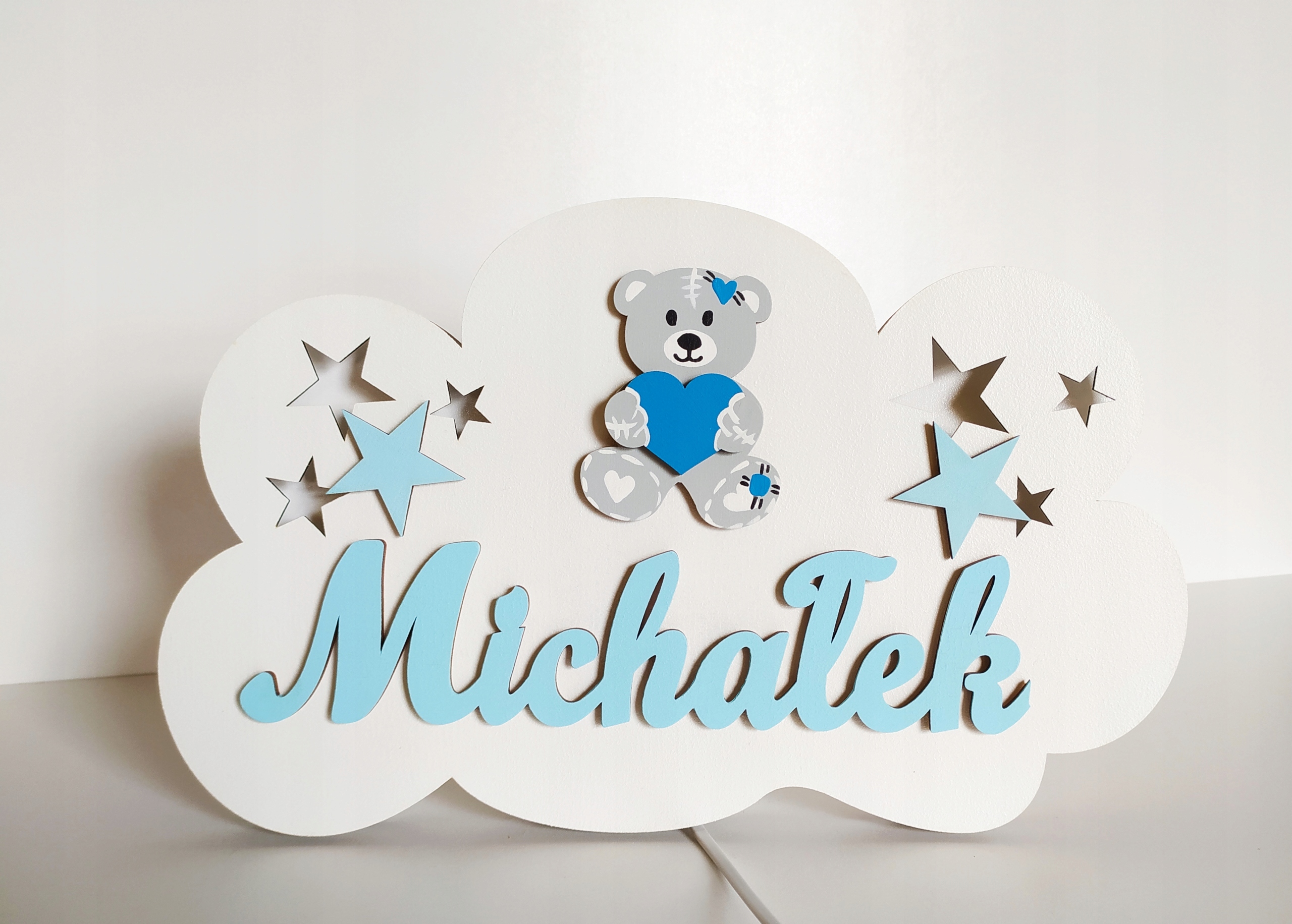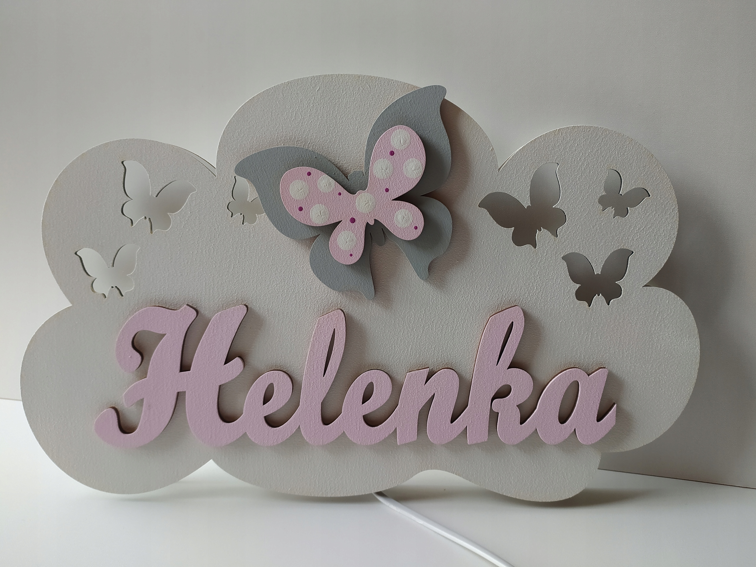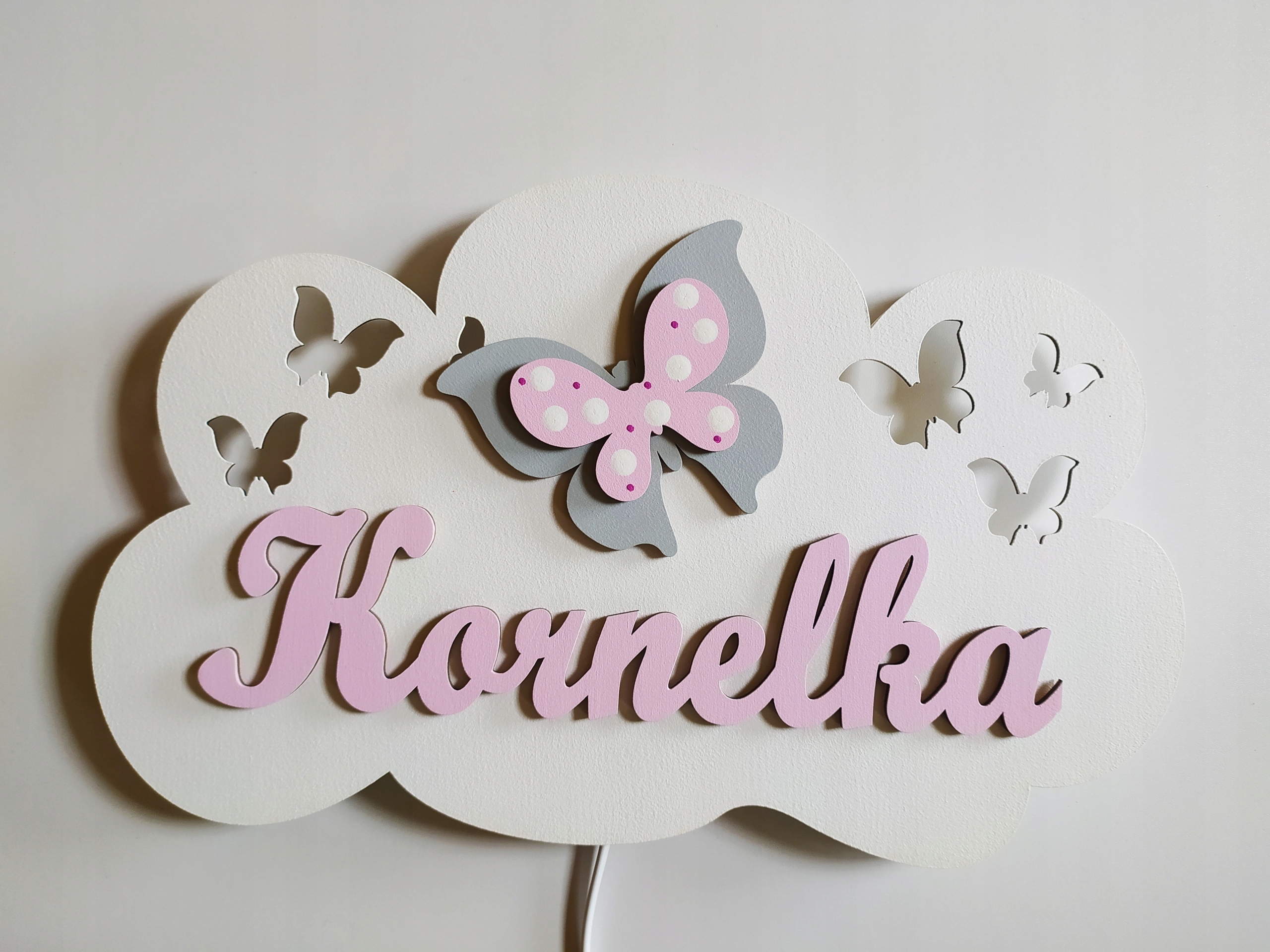 Светильник вырезан -выводим ажурные элементы в виде звездочек и бабочек. Кроме того, на каждом облаке мы размещаем надпись с именем вашего ребенка и один декор размером 10 см на выбор: бабочка, сова, мишка.