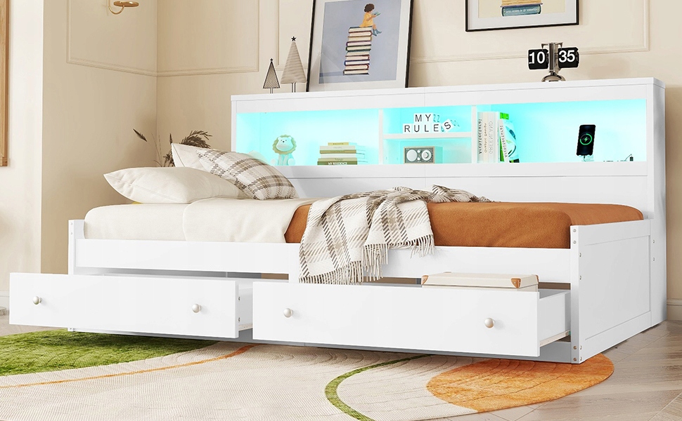 диван, склад -ут -ат диван 90*200 см, складной диван, прикроватная стола, кровать с 2 USB -гнездами и 2 зарядные розетки, окружающее освещение, кровать с двумя ящиками, кровать с рамой (без матраса), сопоте