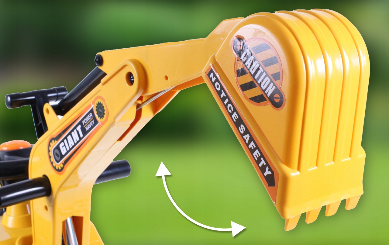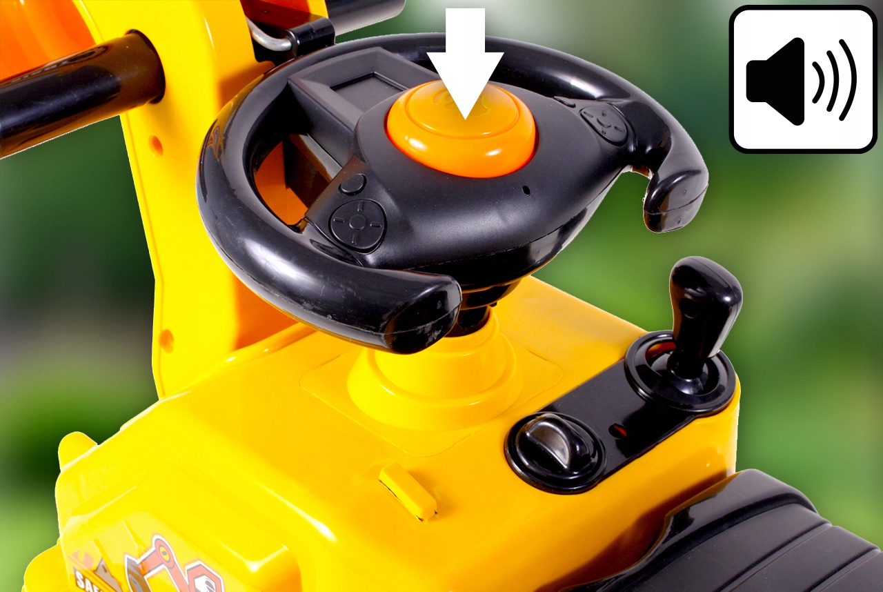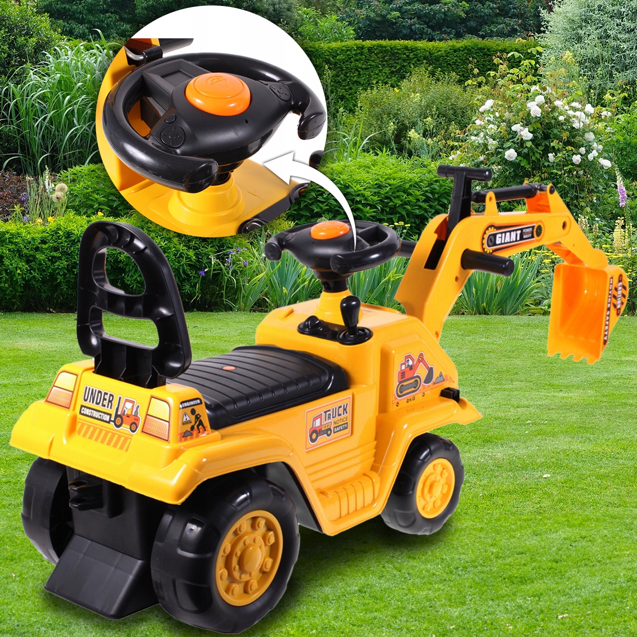 Ребенок управляет транспортным средством, толкая его ногами. Когда он остановлен, он может использовать ковш экскаватора, чтобы подбирать предметы. Катание развивает и тренирует координацию движений вашего ребенка.