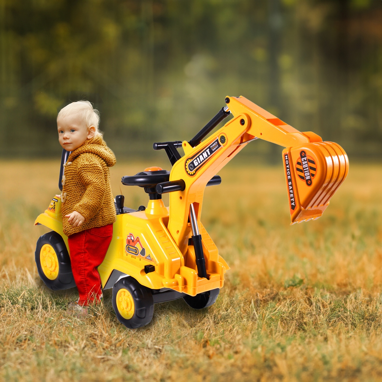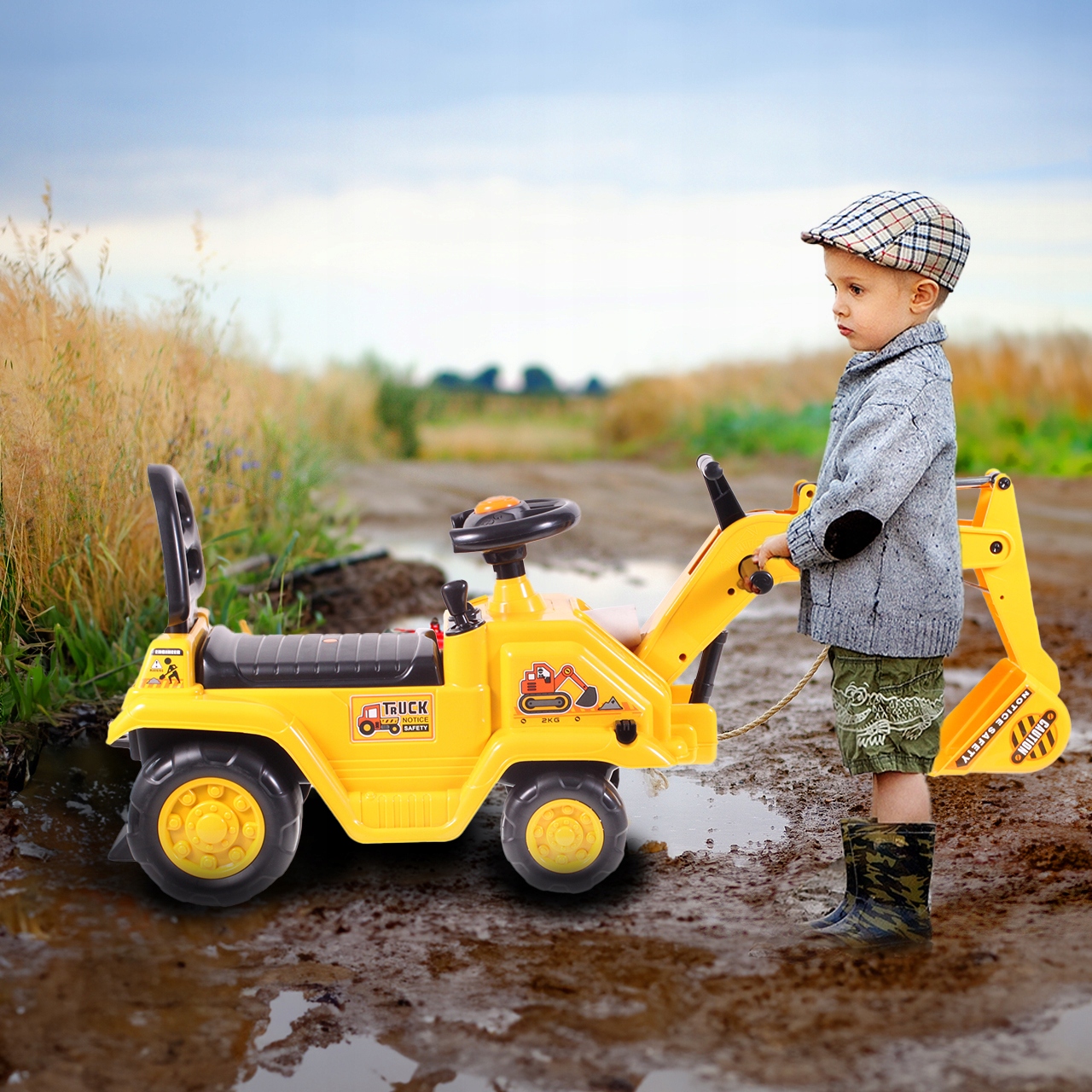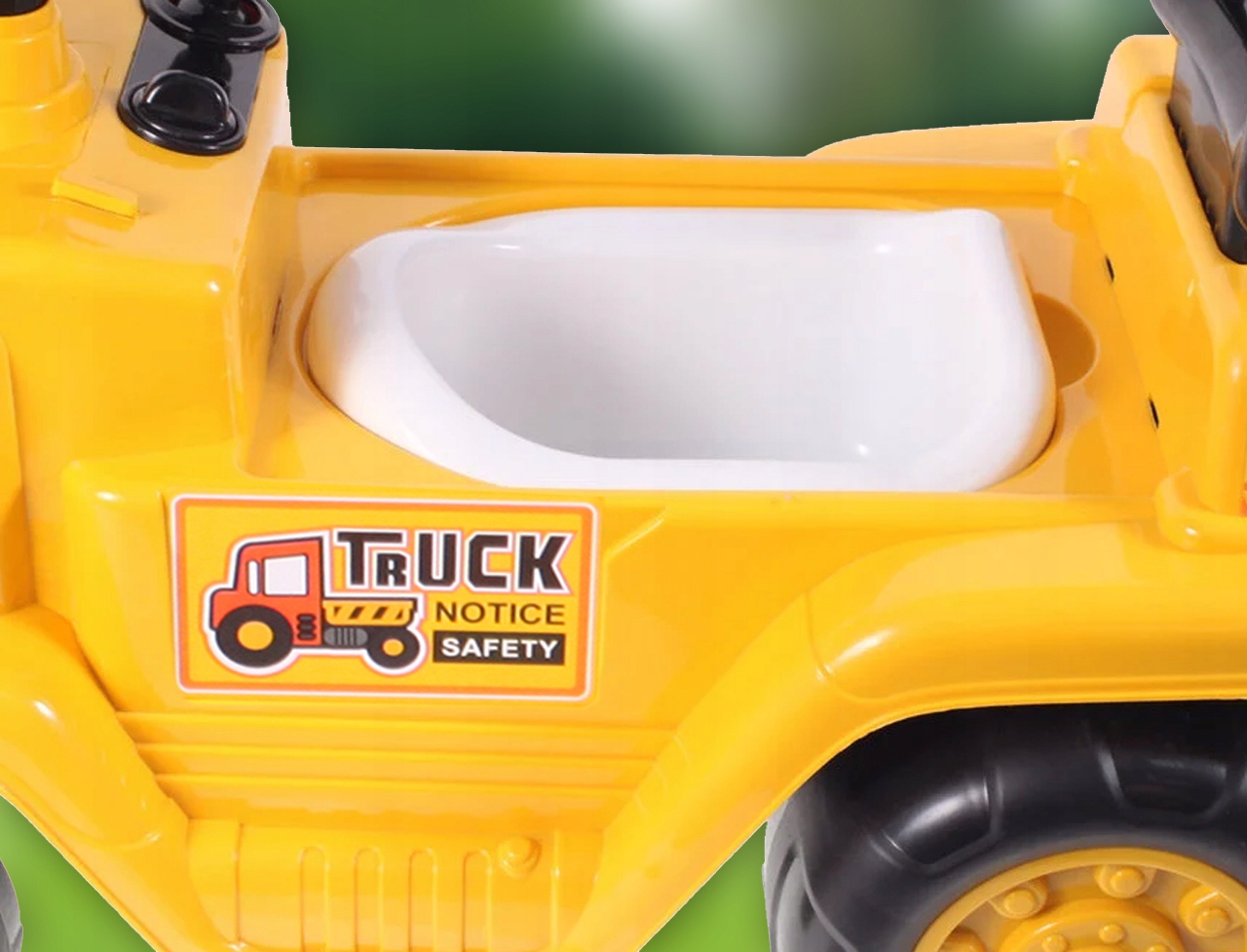 Ребенок управляет транспортным средством, толкая его ногами. Когда он остановлен, он может использовать ковш экскаватора, чтобы подбирать предметы. Катание развивает и тренирует координацию движений вашего ребенка.