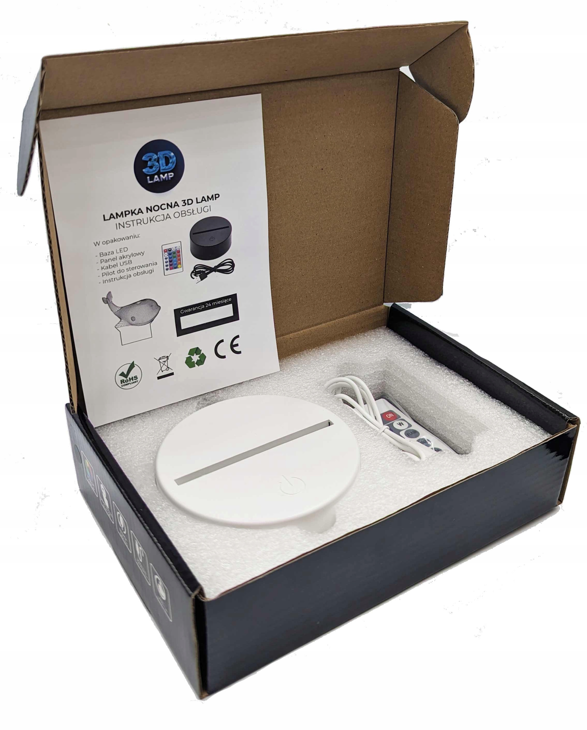 Ночник 3D LAMP LED состоит из оргстекла с гравировкой, лазерной резкой и принтом, выбранного цоколя (*черного, *белого или * прозрачный активный цвет - Этот аукцион включает в себя белую базу), USB-кабель, пульт дистанционного управления с аккумулятором. Основание светильника изготовлено из АБС-пластика с противоскользящими накладками. Питание лампы возможно двумя способами - с помощью USB-кабеля или от 3-х батареек типа АА (батарейки приобретаются отдельно).